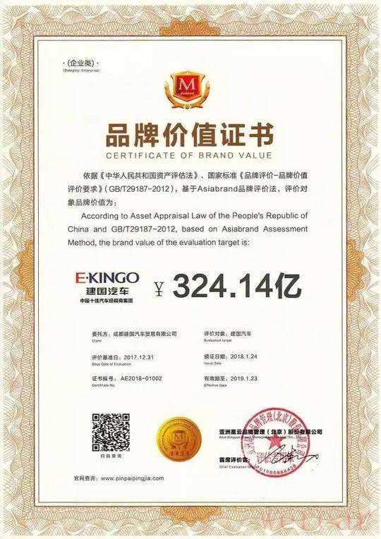 近日,权威品牌评价机构Asiabrand对“建国汽车”品牌2018年品牌价值进行了全面评估,“建国汽车”品牌价值目前已达324.14亿元,在成都汽车经销商中独占鳌头,成为当之无愧的“独角兽”。建国汽车在企业前进的快车道上一马当先,让后进者只能望其项背。