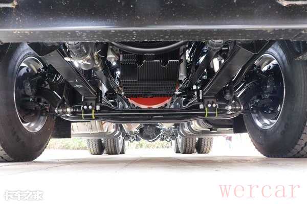 实拍车前桥采用锻钢件材料,工字形断面结构,后桥采用单级减速康迈轮端,前后桥均采用50万公里免维护康迈轮端,后桥速比2.846(同时可选3.083)。