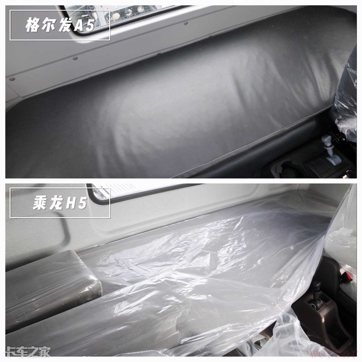 两车都是采用高顶双卧的驾驶室设计,顶部储物柜的设计能够完善长途运输的生活储物需求,格尔发A5内饰上半部分采用了具有居家温馨感的浅色内饰搭配,驾驶员在卧铺睁开眼时迎面扑来的满满温馨的家庭温暖。不过储物空间相对乘龙H5而言,乘龙H5采用的三个大储物柜空间更大,而且下部还设有开放式储物槽,实用性更强,能够放置更多随车物品。