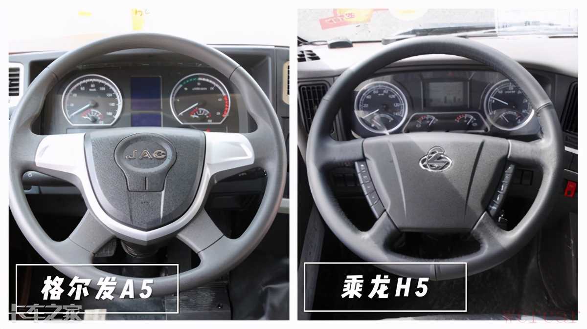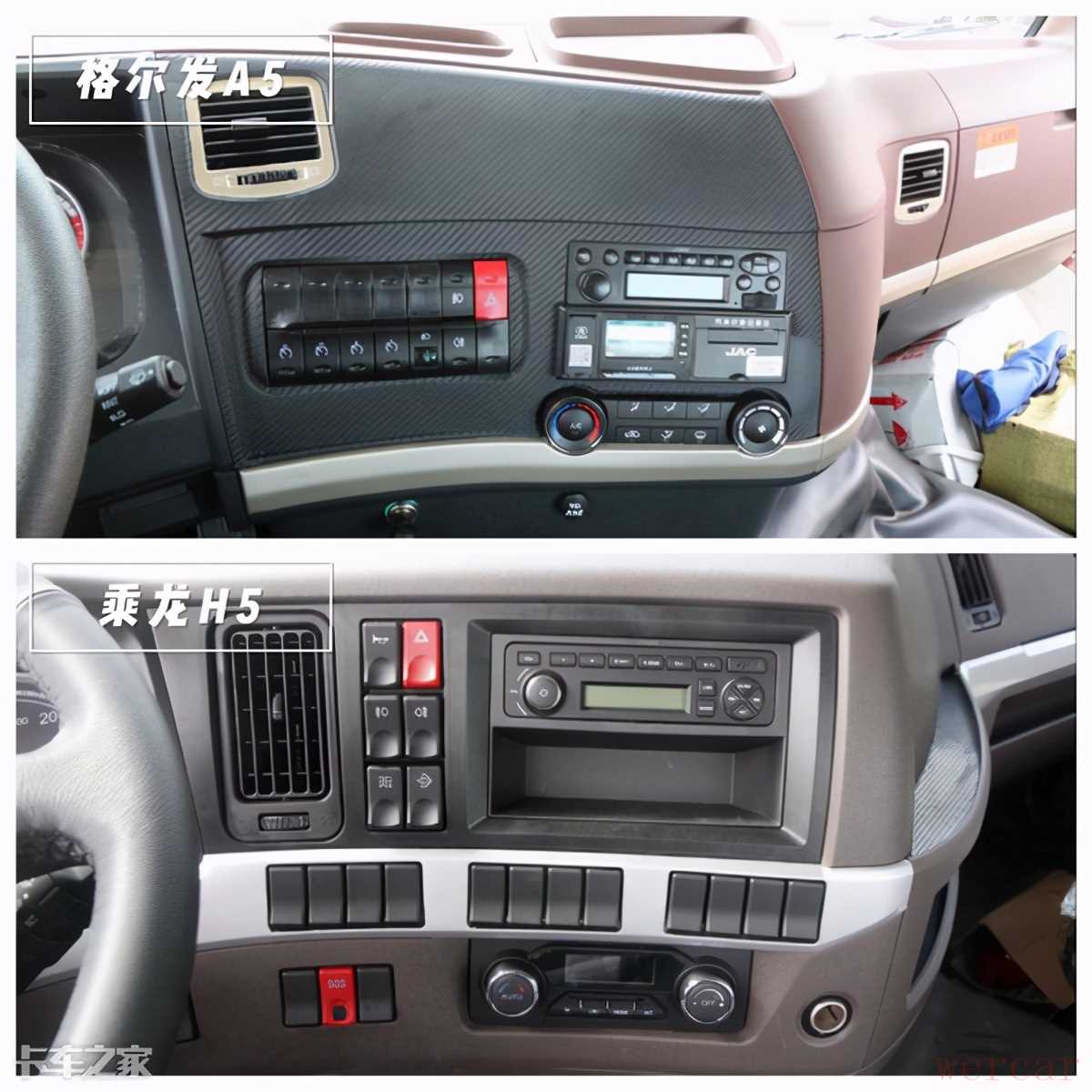 在内饰中控方面长途绿通运输需要的不止是实用性,舒适性配置也格外重要,直接影响到了驾驶员的疲劳程度。两车均采用四幅式方向盘造型设计,乘龙H5配备了多功能按键与皮质包裹,无论是手感还是实用性表现都更加上乘。对于长途运输而言,两车都有配备定速巡航功能,能够大大地解放驾驶员的右脚。