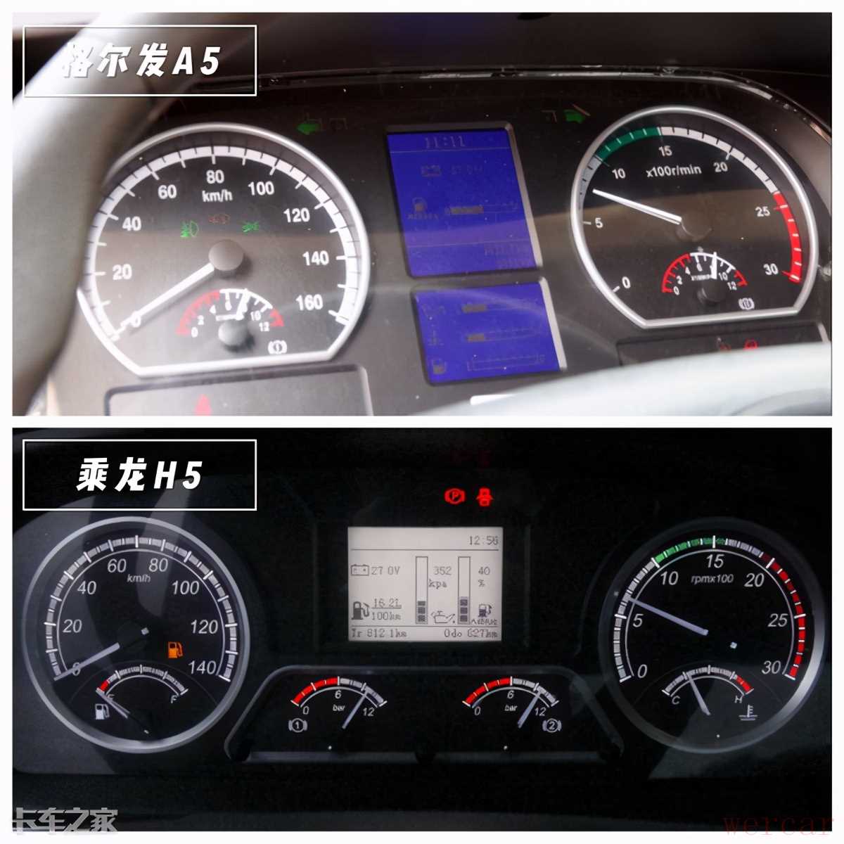 格尔发A5与乘龙H5咋一看都采用了双圆筒仪表设计,但细看乘龙H5的背光与细节设计都要更加顺眼一些,尤其是长途运输,难免会途径夜间行车,太过花俏的背光设计会令驾驶员视觉疲劳,反而越简洁的背光设计越顺眼。
