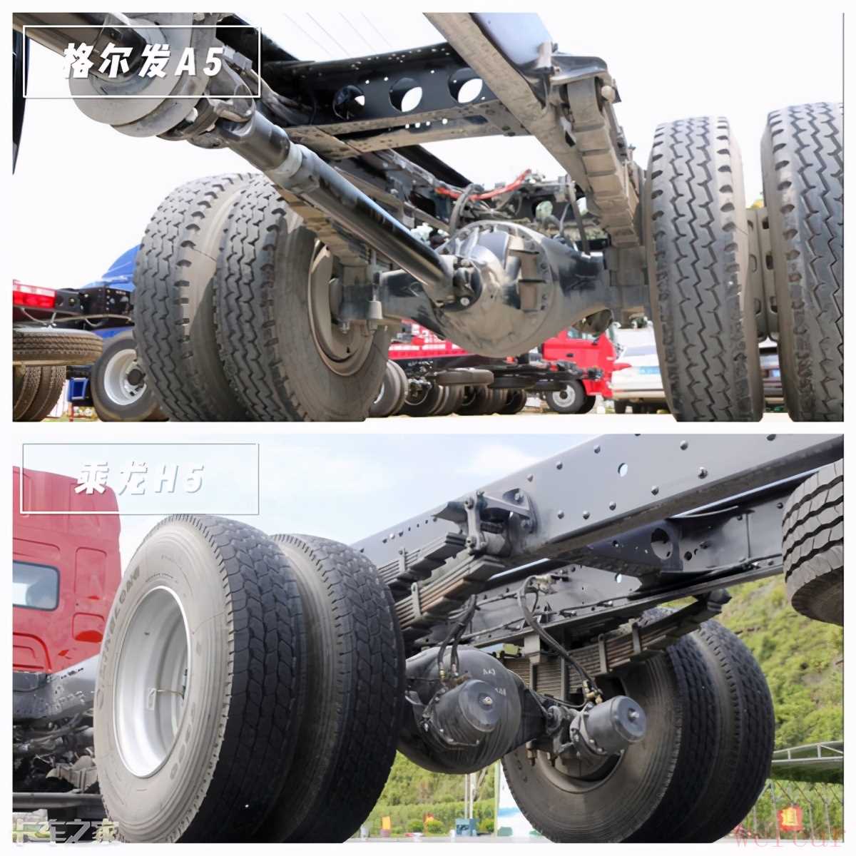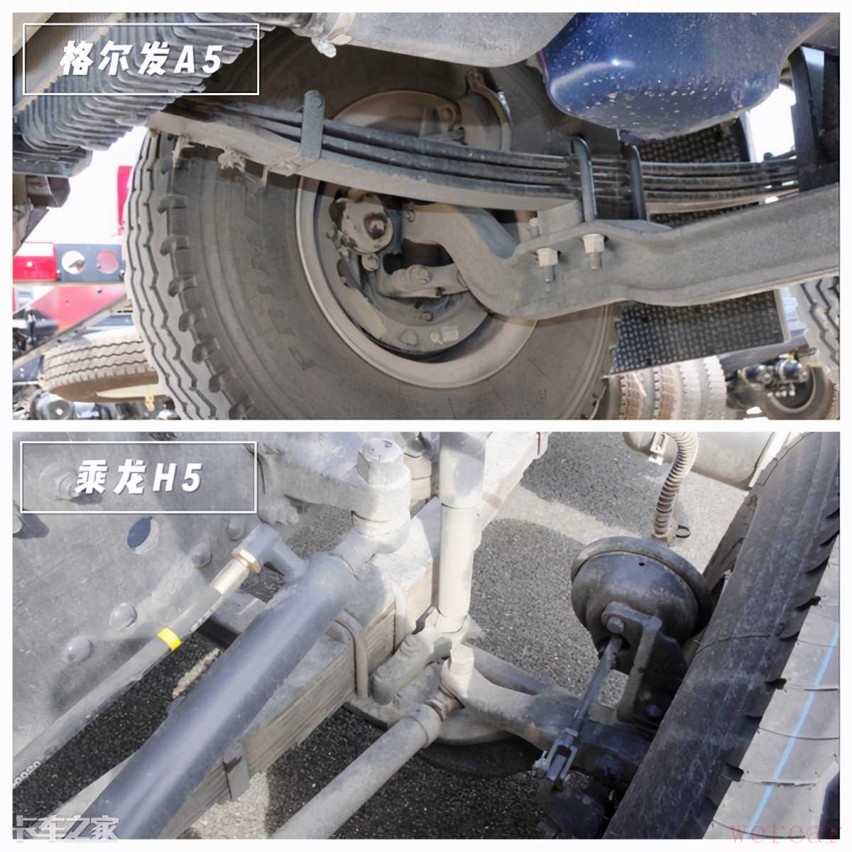 格尔发A5前两轴承载采用了少片簧设计,对于标载运输的老王来说,少片簧设计能够胜任日常运输需要,同时有助于提升行车舒适性,尤其是空车状态下,驾驶室的颠簸明显要小很多。相比乘龙H5在这方面的设计更偏向于载重量大的运输工况,除了簧下重量以及行驶舒适性之外,乘龙H5底盘配置没有明显的短板。