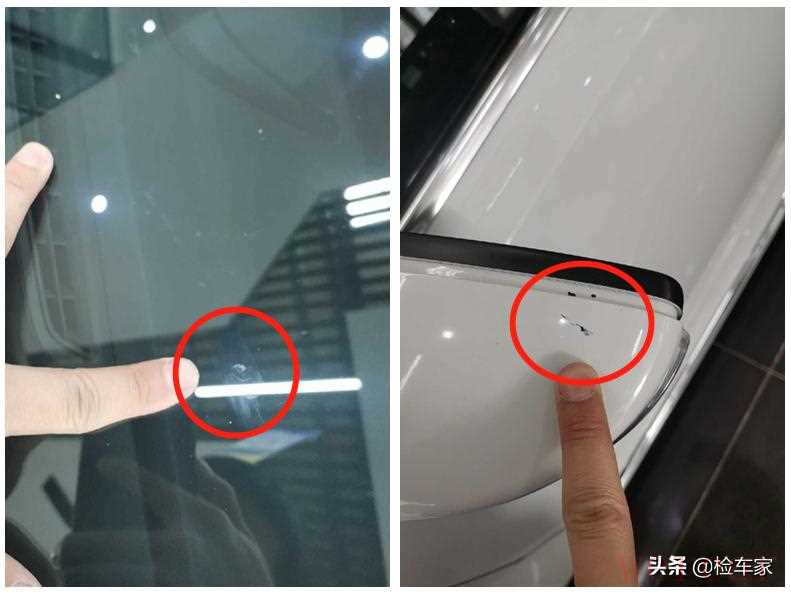 随后发现前挡风玻璃上有两个石子蹦出来的痕迹;左侧后视镜油漆都喷到了黑色塑料上,遮蔽没做好。