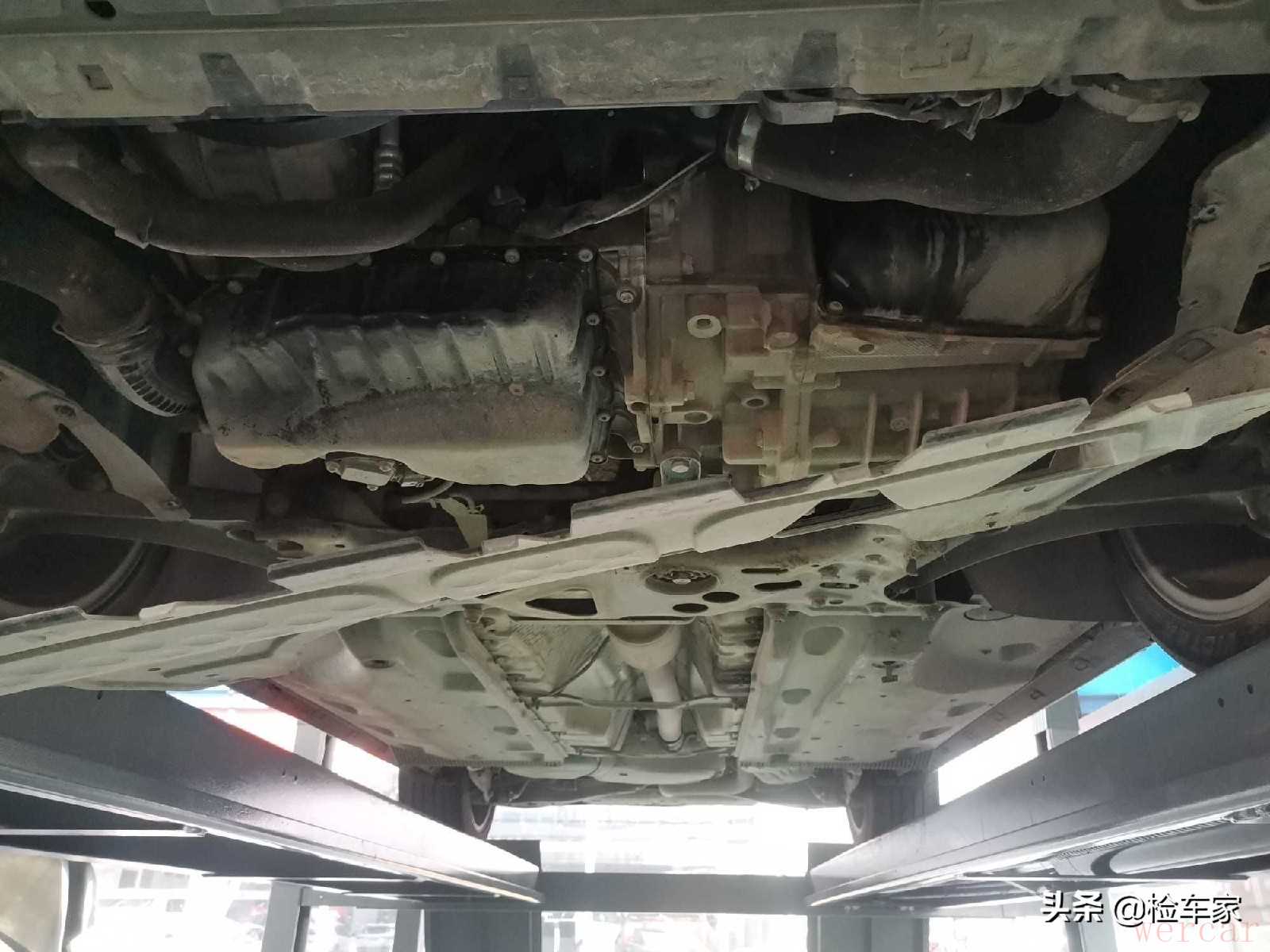 于是就在市场内找了个升举机上架,可以看到发动机变速箱非常干净。没有渗油漏油的痕迹,也没有吊装维修迹象,不过还是要近距离在仔细观察观察。