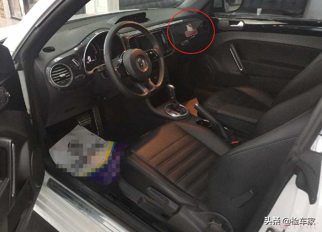 打开车门,发现副驾仪表台上还贴着HelloKitty的卡通贴纸,看来前任车主也是个充满少女心的小姐姐无疑了。看来卖家说的本市美女一手车,可能不是一个谎言。而且搭眼一看,内饰的成新度确实还不错,也没有什么磨损,就是这个都是2.0T版本的甲壳虫了,还配的是手动调节座椅,稍微有一点拉胯呢。还是接着检测吧。