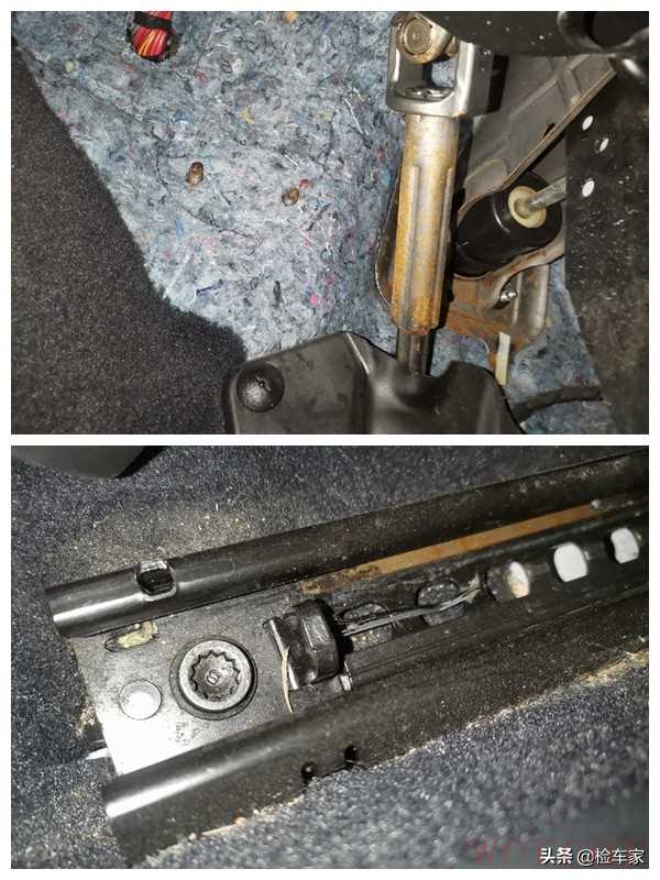可以看到方向管柱部分有些锈蚀了;座椅的滑槽内也有些锈蚀,但是座椅螺丝没有拆卸痕迹。具体是不是涉水或者泡水,需要更多细节。