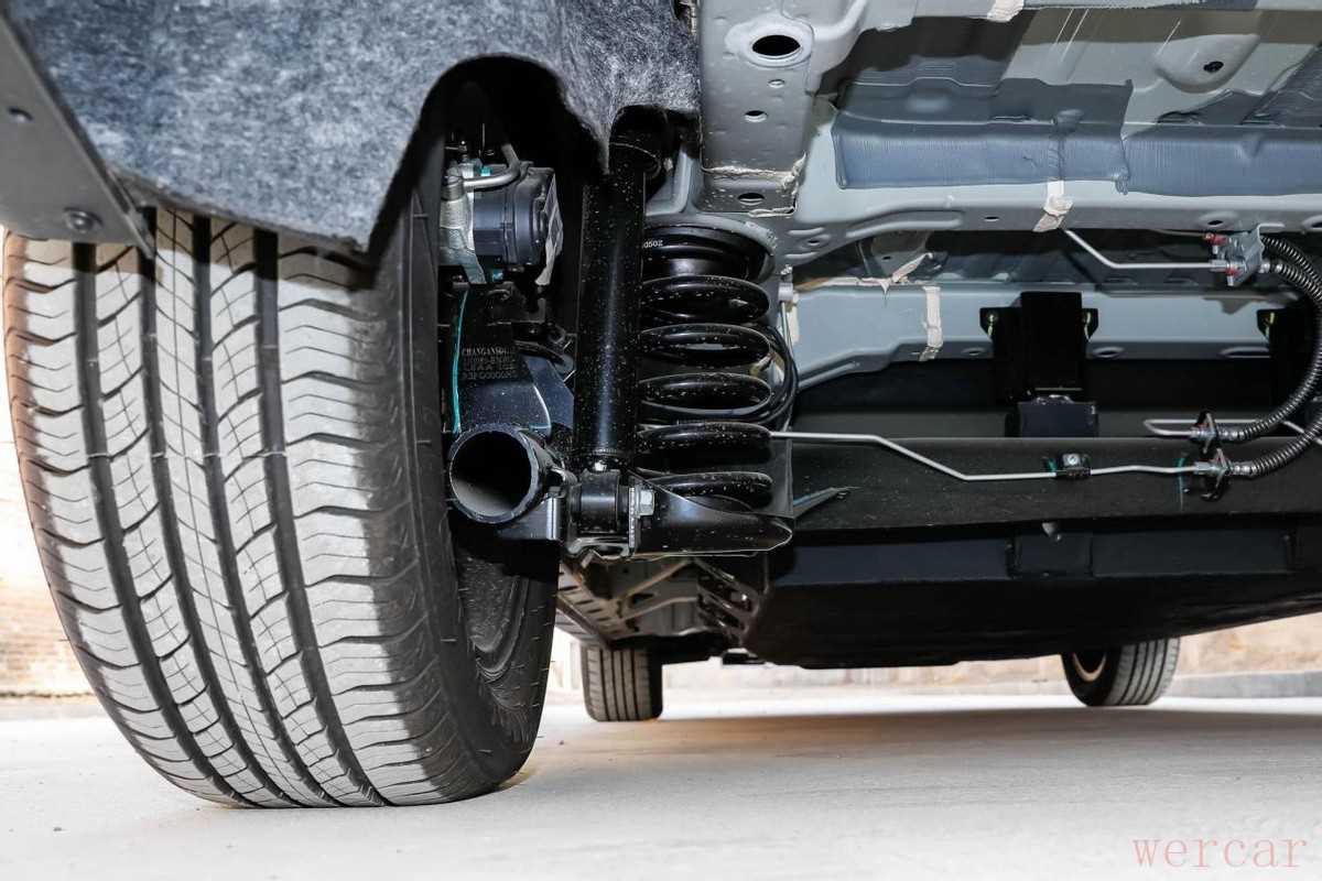 采用前麦弗逊独悬,后纵臂扭转梁式非独立悬架,采用半承载式车身结构。这种车身结构可能很多人没听过,其实就是介于承载式车身和非承载式车身中间的结构,有完整的独立车架,但是和车身是刚性连接的。