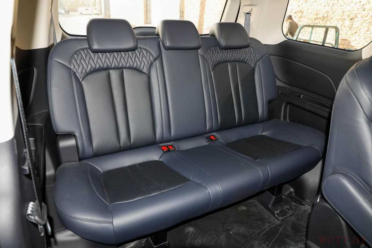 中间为两个独立座椅,可以前后移动调整。在不调整前排座椅的情况下,乘员坐在第二排,头部有足足一拳空间,腿部最多还有2拳空间,如果第三排坐了人,可以将第二排座椅适当往前挪动。相同身高的乘员在第二排座椅挪到最靠后的位置时,腿部仍然有大约2指空间,头部为3指空间。因此这台车的车内空间表现是非常出色的,就算满载都不会显得拥挤。