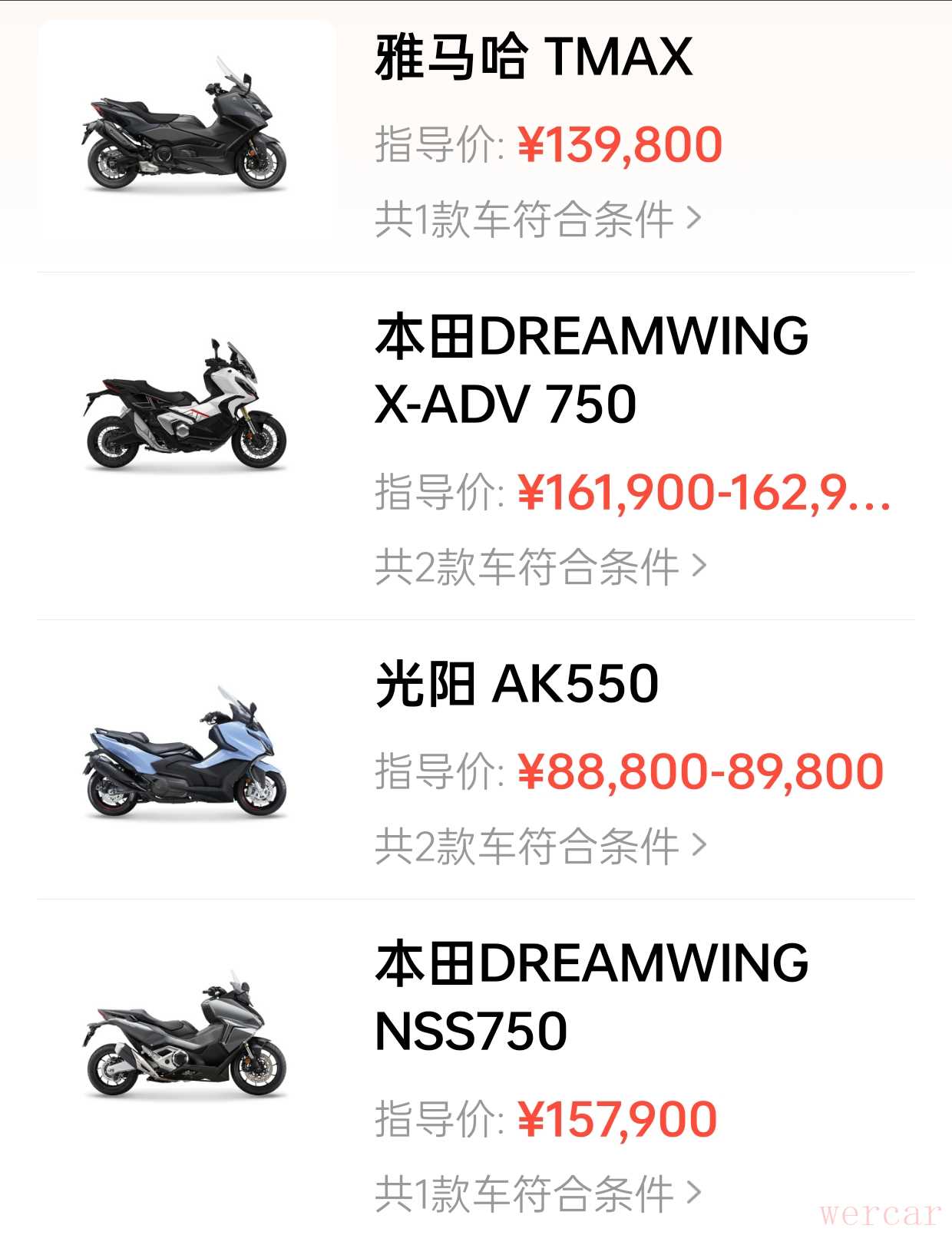 受这困扰后,我转眼也看过其他踏板车。筛选条件链条传动,搜出来的结果,哇~都是好踏板!总共4款,三阳MAXSYM TL、雅马哈TMAX560、本田XADV750、NSS750,足够顶!看了价格,着实吓我一跳!最便宜的82000元,最贵的162900元。我脑海里此时就一个念头,这是我一个打工仔能买的车么?房都还没呢!抱拳拱手,只是路过而已,打扰了!