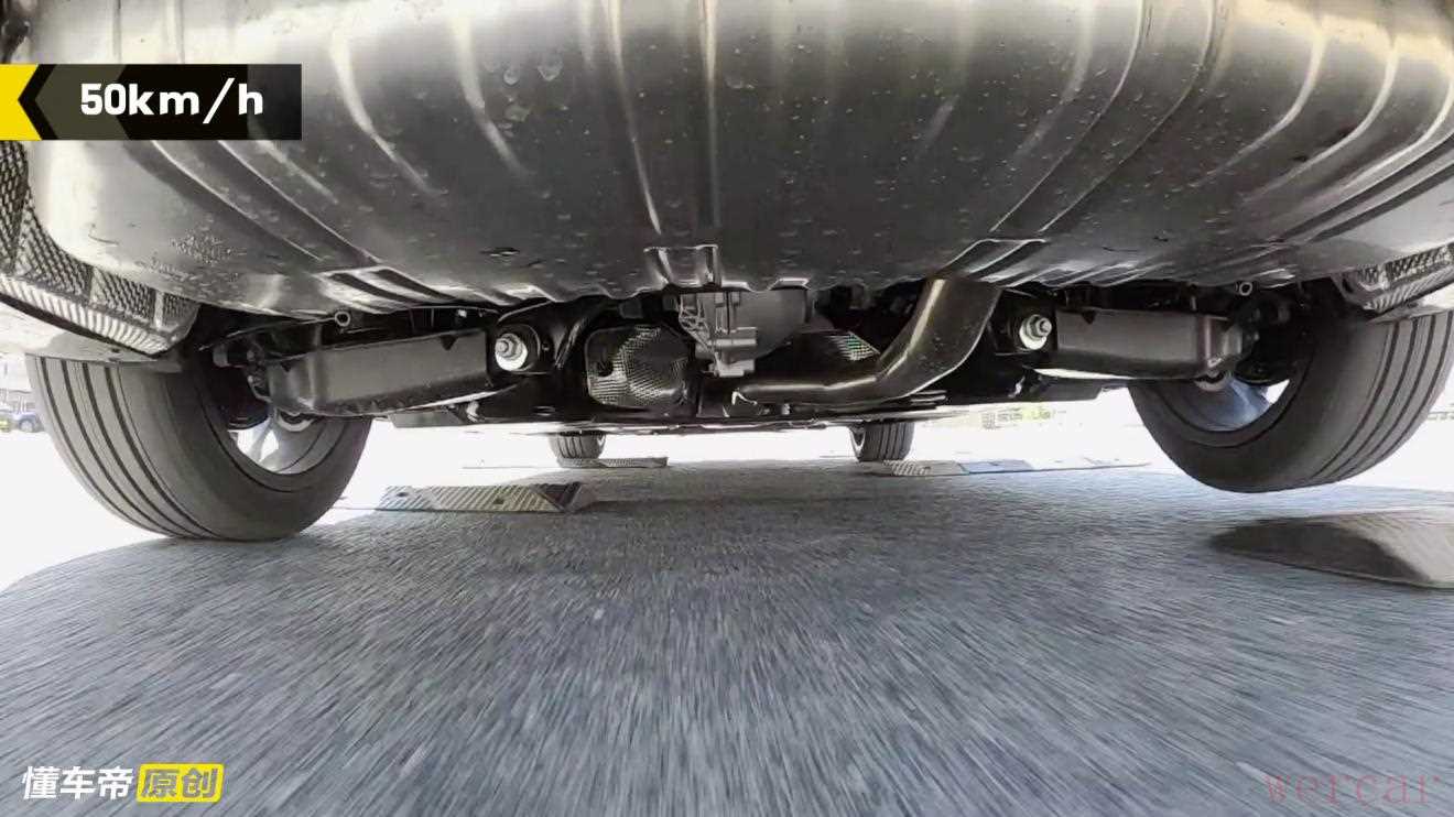 时速提升到50公里,通过减速带时依然谈不上多么舒服,但是底盘一如即往的整,感觉车身就是一整块铁板,给人的印象非常好。通过底盘视角可以看到,虽然CT4的左右两侧悬架都有比较明显的腾空以及弹跳,悬架的反应速度一般,但是好在车身还是比较稳的,坐在车内也确实没有太强的晃动感。