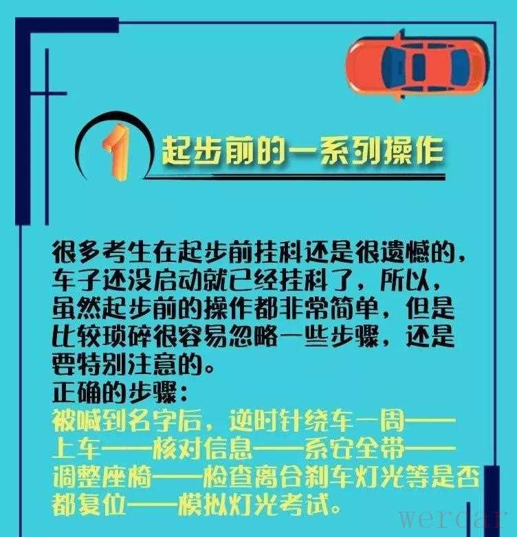 很多考生在起步前挂科还是很遗憾的,车子还没启动就已经挂科了,所以,虽然起步前的操作很简单,但都是一些琐碎的,容易忽略的。