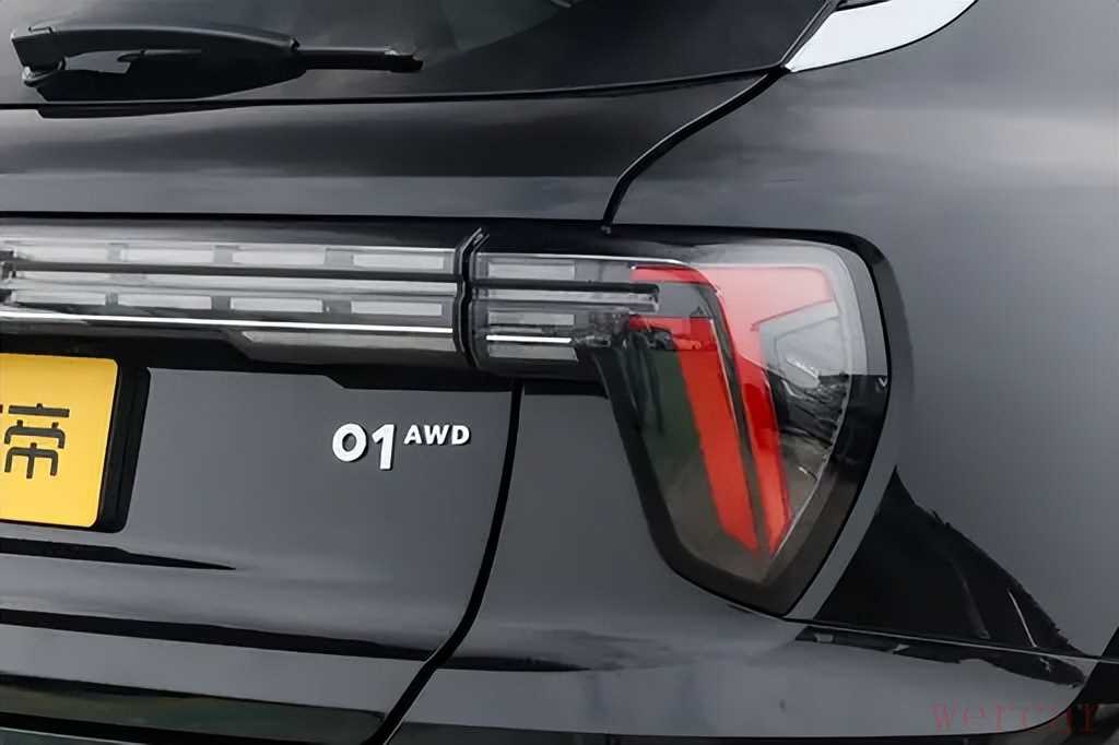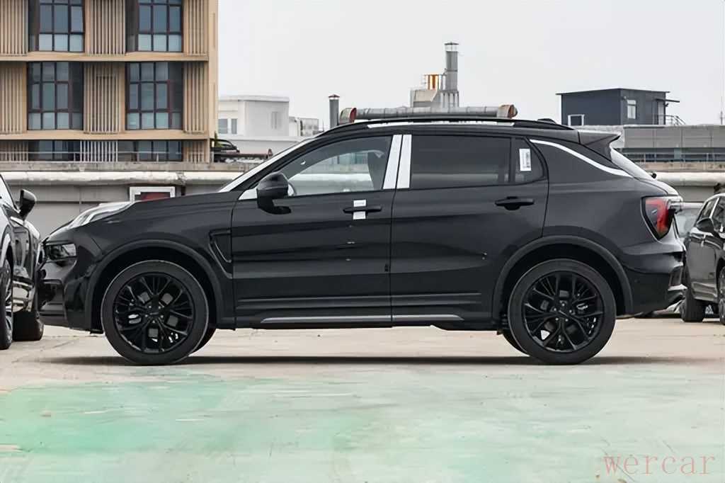 侧面轮廓延续了领克01一贯的简洁风格。整体姿态略微前低后高,肩线从前翼子板贯穿至尾灯,腰线略带上扬,使车身看上去紧致且充满动感。侧裙与轮眉均采用黑色防擦设计,既能在轻度越野时提供保护,又为车身增添了一丝野性。车顶行李架、银色窗框饰条与悬浮式车顶设计,使整车更显都市感与高级感兼具。