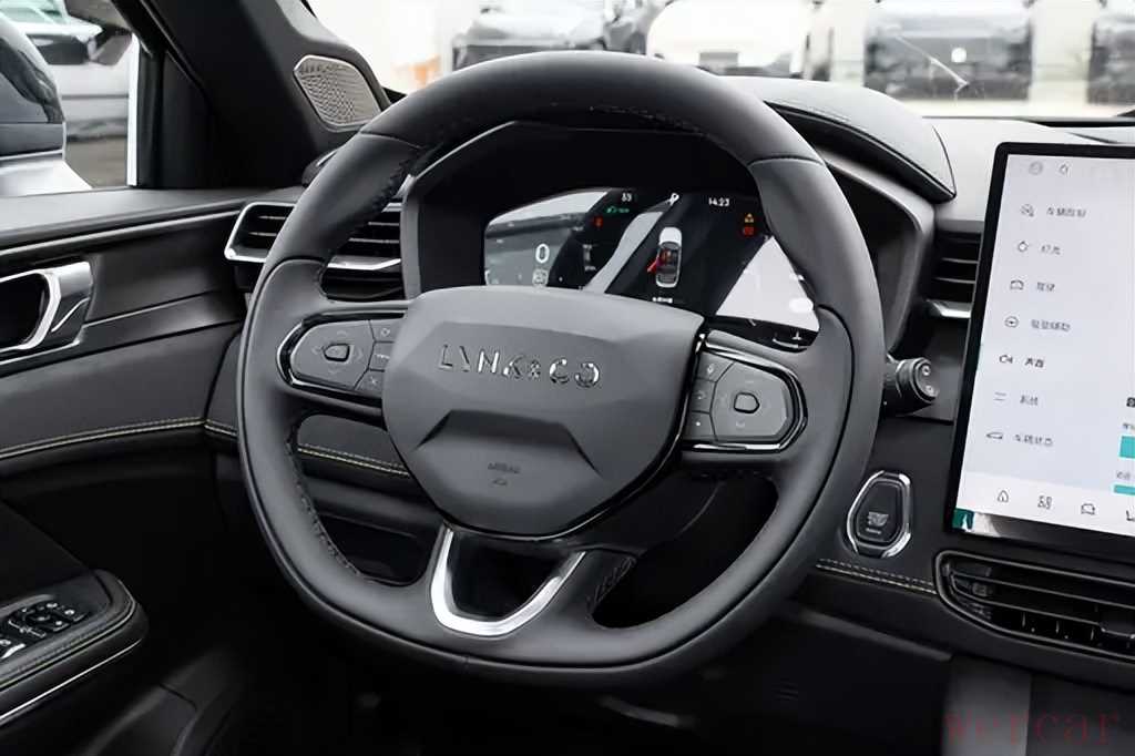 进入车内,焕新版的变化同样。设计师延续了“以驾驶者为中心”的理念,但整体布局更显简约和理性。中控台采用环抱式造型,整体向驾驶席微微倾斜,操作逻辑清晰自然。材质用料上,领克一如既往地厚道。大面积软质皮革包覆辅以缝线工艺,搭配银色饰条与翻毛皮拼接面板,让整个座舱兼具温度与科技感。