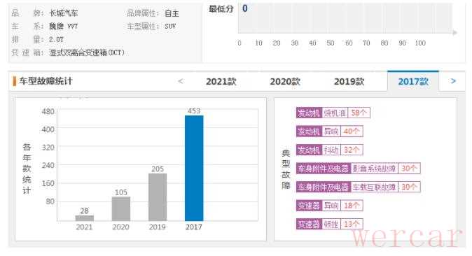 从VV7车主们的描述中我们可以看出,VV7自身的产品问题很多,根据车质网显示的车主投诉数据来看,2017款VV7的车型故障投诉量达到了453条,2019款的故障投诉达到了205条,2020款虽然销量惨淡,但是故障投诉也有105条,就连卖不出去的2021款新车,投诉数量也有28条。从实际的投诉内容上来看,大多发生在变速箱、发动机、车身附件、电器系统等方面,例如变速箱异响、发动机抖动、换挡顿挫严重、刹车异响、仪表台开裂等问题。这确实对不起豪华车的身份和定位,虽然WEY在2020年的新车上面做出了积极的改正,问题已经少了不少,但是在发动机和变速箱上面又出现了新的问题。