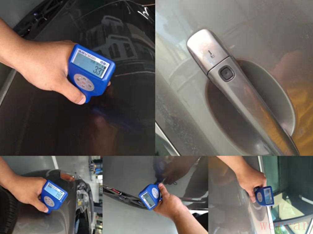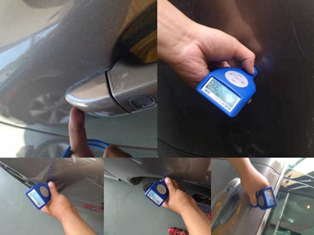 车身覆盖件经过检测,发现左前叶子板喷漆;左前门喷漆还把门把手拆坏了,用胶粘上去的,再看一下,门板的胶条也老化了;左前门腻子做漆;左后门喷漆;左后叶子板喷漆。