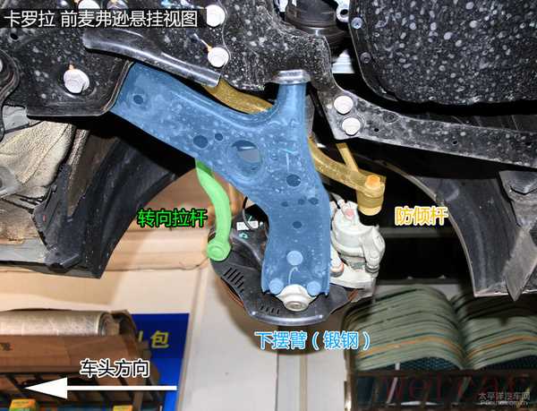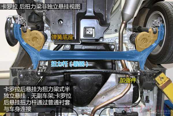 后悬挂为扭力梁式半独立悬挂,无副车架;卡罗拉后悬挂扭力杆通过普通衬套与车身连接。