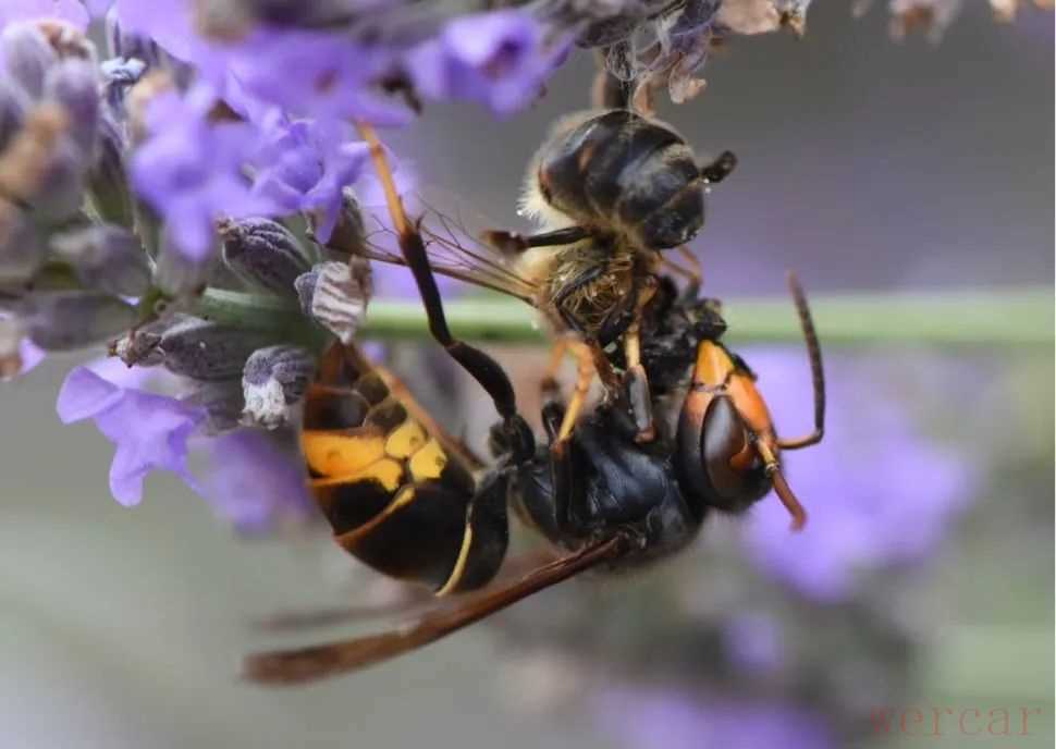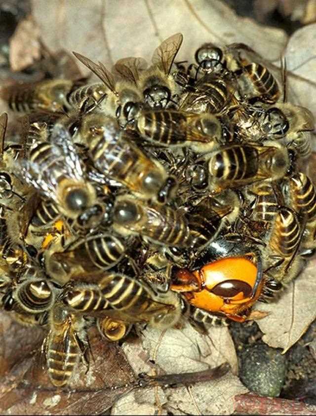 其实并不是蜜蜂的太弱,而是因为对手太强。不知道你有没有接触过亚洲大黄蜂或者其尸体,它们的外壳十分坚硬,相较之下蜜蜂的刺有些无能为力。那么面对亚洲大黄蜂,蜜蜂只能任其宰割吗?并非如此。当用蛮力无法打败入侵者的时候,一些蜜蜂就探索出了新的应对方式,利用己方的数量优势将入侵者活活“热死”。亚利桑那大学自然资源与环境学院副教授凯蒂·普鲁迪奇(Katy Prudic)表示,尽管大黄蜂体型庞大,有致命的毒刺,还有可怕的名字,但日本蜜蜂已经进化出一种“伏击防御”的方式来对付这些大黄蜂。我们之前提到过,亚洲大黄蜂屠杀前会派一些“侦察兵”打探情况,这成了日本蜜蜂的突破口。它们无法抵抗一群大黄蜂的攻击,但可以设法制服这些侦察兵,以此保证自己和后代免受攻击。