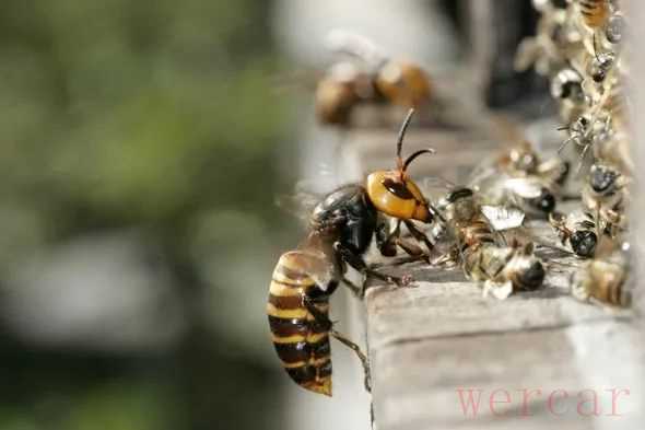 不过和绝大部分生物一样,亚洲大黄蜂通常不会攻击人类或动物,除非它们觉得自己的巢穴受到威胁。与蜇人相比,它们大量捕杀蜂群的事迹更加闻名。亚洲大黄蜂的食谱很丰富,包含了多种昆虫,其中蜜蜂是它们的最爱。事实上很多种胡蜂都有捕食蜜蜂的习性,虽然两者外形相似,而且名字里都带“蜂”,但胡蜂属于膜翅目胡蜂科昆虫,而蜜蜂属于膜翅目蜜蜂科,也就是说,胡蜂并不是一种蜜蜂。但它们也是有很深的渊源的。美国昆虫学家米切纳(Michen-er)认为,蜜蜂是从1亿年前的细腰胡蜂进化而来。变异的胡蜂改变了捕猎其它节肢动物幼虫的肉食性习性,成为采集花粉及花蜜饲喂幼虫的素食主义者,没想到最后又落为胡蜂的盘中餐。