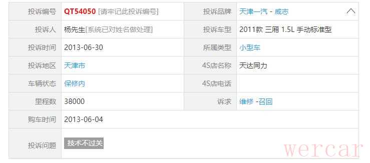 想先大家看到这里都已经对于天津一汽的威志有了一定的了解,那么我们便事不宜迟这就开始我们今天的案例报道吧。事情发生在我国的天津市,杨先生在2013年的6月4日于天达同力4s店中购买了一台天津一汽的威志,但是买了还不到一个月,车辆就出现了一些离奇的故障,究竟是怎么一回事呢?让我们来一起看一下。在购车以后没多久,杨先生正驾车行驶在路上,但是很快便发现车辆在行驶过程中出现了自行熄火,无法着车,故障灯亮的故障,随即杨先生便打电话给4s店,不一会4s店的救援便来了,但是救援人员竟可以打着发动机,便把杨先生的车开去了4s店中进行检查,但是并没有检查出任何的问题,并且故障灯也自己熄灭了,并且杨先生被告知车辆并没有问题,杨先生也并没有把这件事太过于放在心上,便开车回家了。但是没想到的是,车辆在不久后有一次出现了相同的故障,还是相同的叫救援,检查不出问题,杨先生称,现在出行基本都会开着开着自行熄火一两次,提心吊胆的不知道什么时候会熄火,每次出现都是等半分钟重新打着车。期间杨先生也打电话给4s店的售后进行问询,但是售后那边也说没有办法,汽修厂也去过几次,但是无一例外,都是检查不到问题。无奈之下杨先生只好把这件事发在了我们投诉网,希望可以得到解决,目前这件事已经得到了解决。