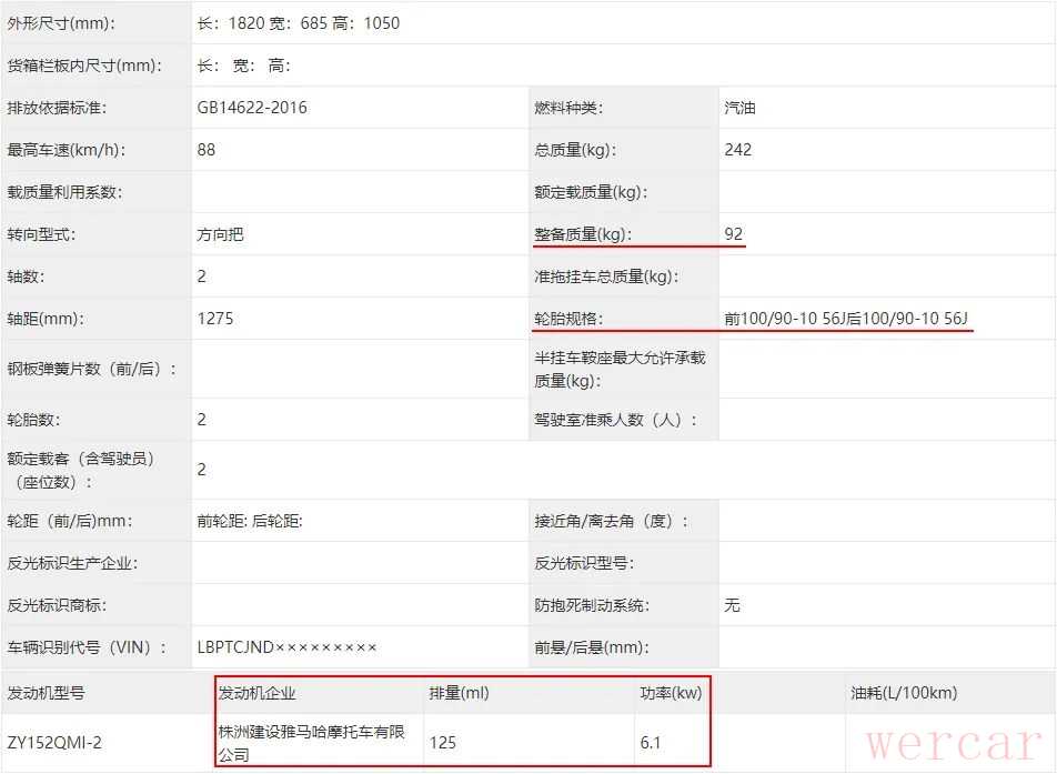 发动机还是和建设雅马哈现在一众125踏板一样,蓝芯125cc单缸风冷发动机,最大功率也还是6.1kW。整备质量92kg比现款福喜重了2kg,前后100/90-10的轮胎尺寸,比现款的90/90-10略大一点。