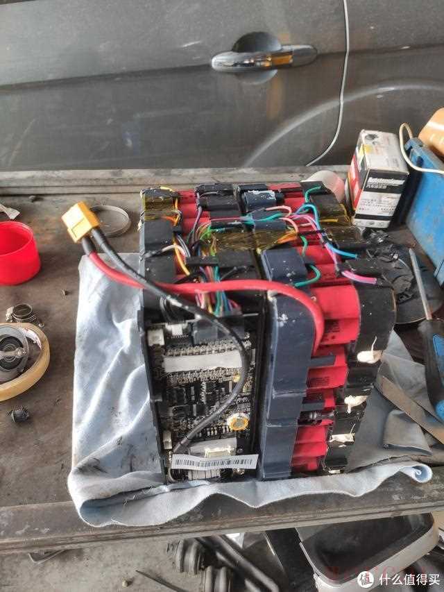 一顿操作后,电瓶被我整个拆出;绕过保护板对电池组进行测量,发现仅存4伏左右的电压,而通过保护板进行正常充电的前提是,锂电池组必须保有30伏左右的电压;那位萧山的朋友得知此时电池仅存4伏左右,表示能救活的几率渺茫。(保护板:用于车身电脑与电池进行检测温度、通信等;另外,保护控制锂电池防止过放过充,在特定情况下进入保护状态)