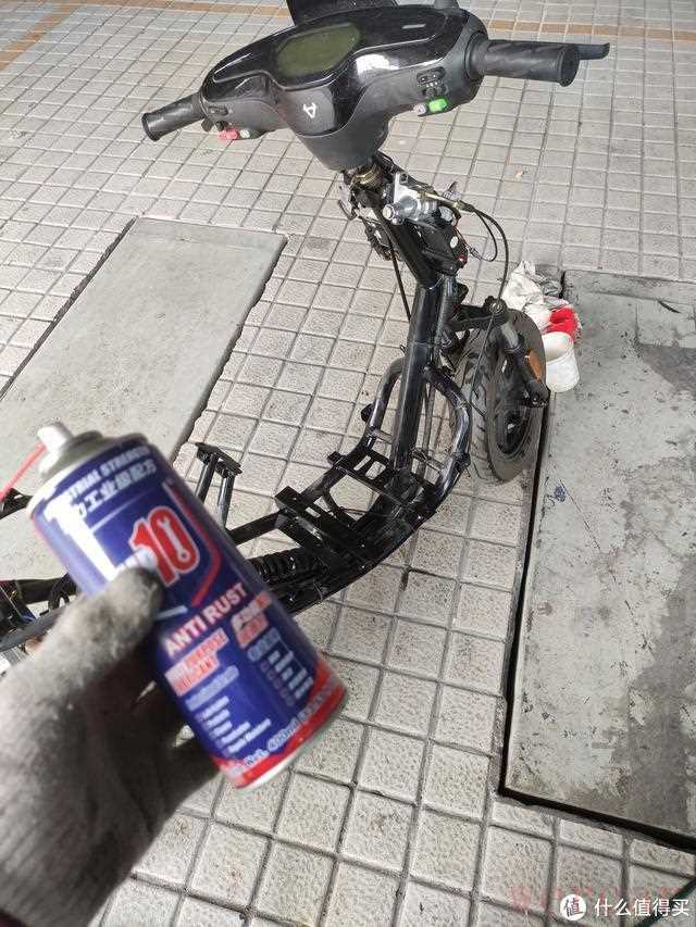 下一步开始为整车架的焊接端面和部分生锈的螺丝孔位进行除锈工作,在除锈这一部分需要拿捏得当注意分寸;我采用的是罐装WD40除锈剂,喷在生锈金属的表面浸泡几分钟后做一次全车清洗。
