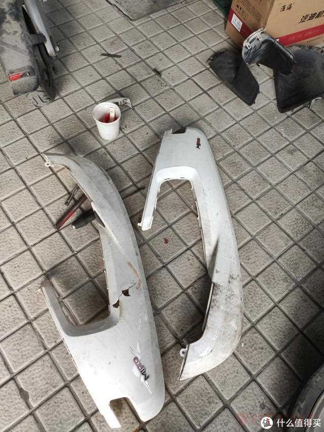 上图为侧面车体盖板,可以看到车体盖板已经破了两个洞,另外护腿板左下角也有破裂的痕迹;本打算购买新的外壳进行更换,在此不得不说,小牛就是小牛购买整套外壳就需要花费近1千块左右;然而,经过一番研究后,我决定将必须需更换的零件进行购买更换,外观件可以修复的那就尽可能的修复!