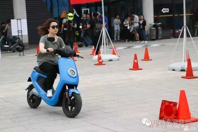 首先是车身整体的线条比较简洁,同时也非常小巧,体验场地也设置了 S 形的弯道障碍。实际体验下来,小牛 M1 的最大龙头转向角度大约在 60 度左右,算是比较灵活。