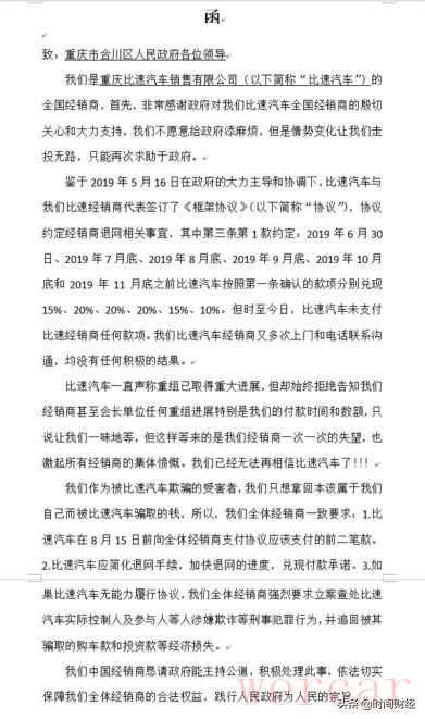 此前的2019年初,48家经销商聚集在比速汽车重庆大本营,并联名签下致厂家的函件讨要说法。经销商们称,鉴于比速汽车的行为造成他们严重亏损,要求厂方将包括但不限于保证金、建店补助、销售返利、销售款等全额返还。