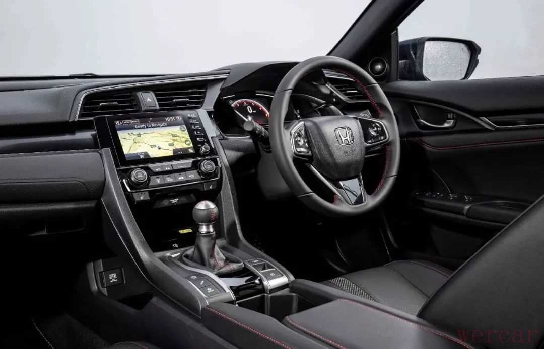 车内也多处也加入了具有暗示性的亮黑色饰条和红色缝线。