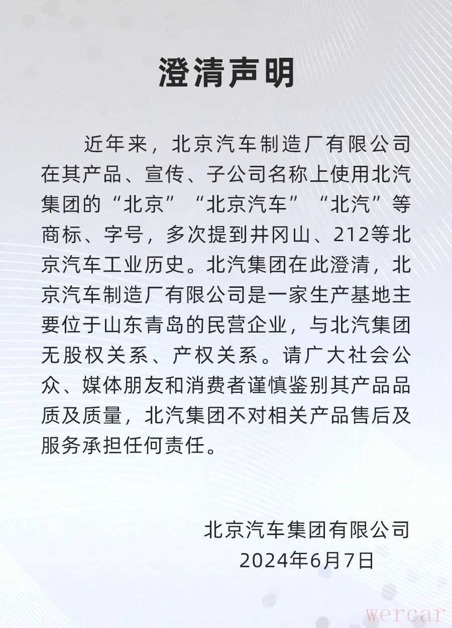 ,时长00:34实际上,此次并非北汽集团首次针对212车型进行澄清了。早在去年,北汽集团就曾发布声明称,近年来,北京汽车制造厂有限公司在其产品、宣传、子公司名称上使用北汽集团的“北京”“北京汽车”“北汽”等商标、字号,多次提到井冈山、212等北京汽车工业历史。北汽集团在此澄清,北京汽车制造厂有限公司是一家生产基地主要位于山东青岛的民营企业,与北汽集团无股权关系、产权关系,北汽集团不对相关产品售后及服务承担任何责任。相关资料显示:北京汽车制造厂有限公司成立于1951年,是一家从事汽车制造的民营企业。1996年,北京汽车制造厂(BAW)与全国99家企业出资组建了北汽福田公司,在1998年上市,经营范围主要从事商用车开发和生产。2007年9月14日,北汽控股的全资子公司北京汽车摩托车联合制造公司将其持有的北汽福田和北京汽车制造厂有限公司的股权资产划转给北汽控股。2010年9月,北汽股份成立,2011年初,北汽制造资产被划归至股份公司。2015年,应北京国资委的要求,北汽集团将自己所持的北京汽车制造厂股权以1.17亿元全部挂牌转让给低速电动车领域颇有名气的富路集团,北京汽车制造厂正式与北汽集团正式脱钩。次年,北京汽车制造厂与北汽集团正式脱离关系,成为了一家民营企业。2020北京汽车制造厂被山东魏桥集团收购,总部迁至青岛,纳入魏桥集团旗下。目前,虽然两者共享"北京"前缀,但实际上在股权关系上早已没有关系。