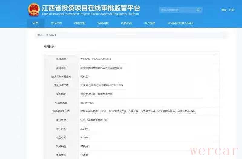 记者查阅江西省投资项目在线审批监管平台发现,比亚迪抚州新能源汽车产业园配套项目总投资约26.77亿元,项目总面积约450亩,新建零部件厂房、仓储库房,以及员工宿舍、饭堂等配套设施,并增加配套设备,计划于2021年开工,2023年竣工。