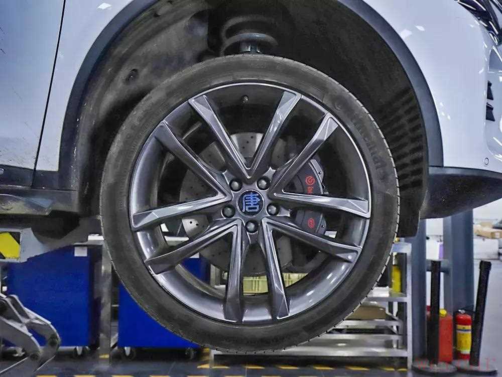 先来对比两台车的轮胎,测试的这台全新一代唐DM是早期下定的版本,厂家免费升级了轮胎和刹车,配备的是一套265/40 R22的马牌高性能轮胎。这套轮胎配上铝合金轮毂不仅视觉效果非常运动霸气,更重要的是它的抓地力非常出色。轮胎的抓地力越好,越有助于提升车辆的加速、刹车和过弯性能,同时也能提高日常行车的安全性。这套马牌轮胎比较贵,市场价格大约为3000元/条,一套4条轮胎总共要1万多元。