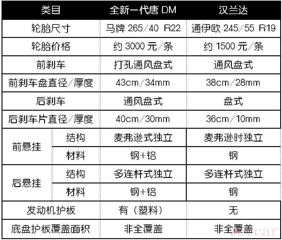 经过一番实际的对比,同样作为一台中型SUV、价格区间也差不多,全新一代唐DM与汉兰达在底盘方面有一定的差异。全新一代唐DM无论是在轮胎规格、制动系统、底盘悬挂用料方面,都比汉兰达有不小的优势。