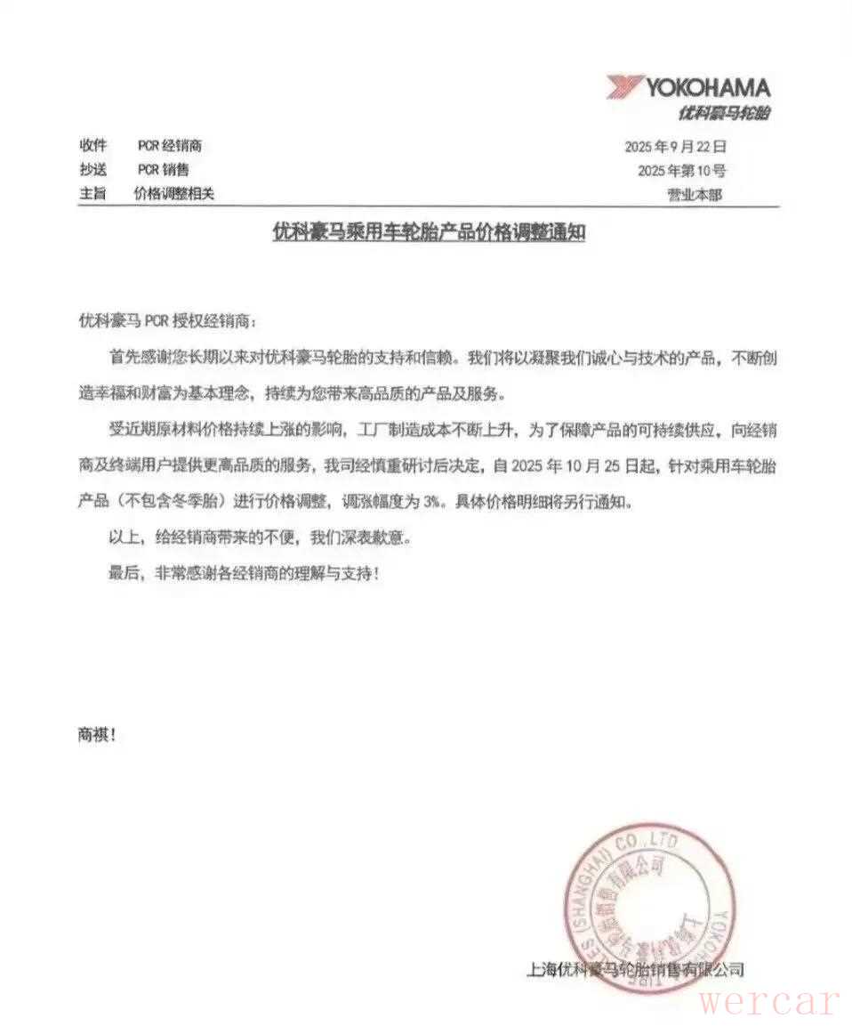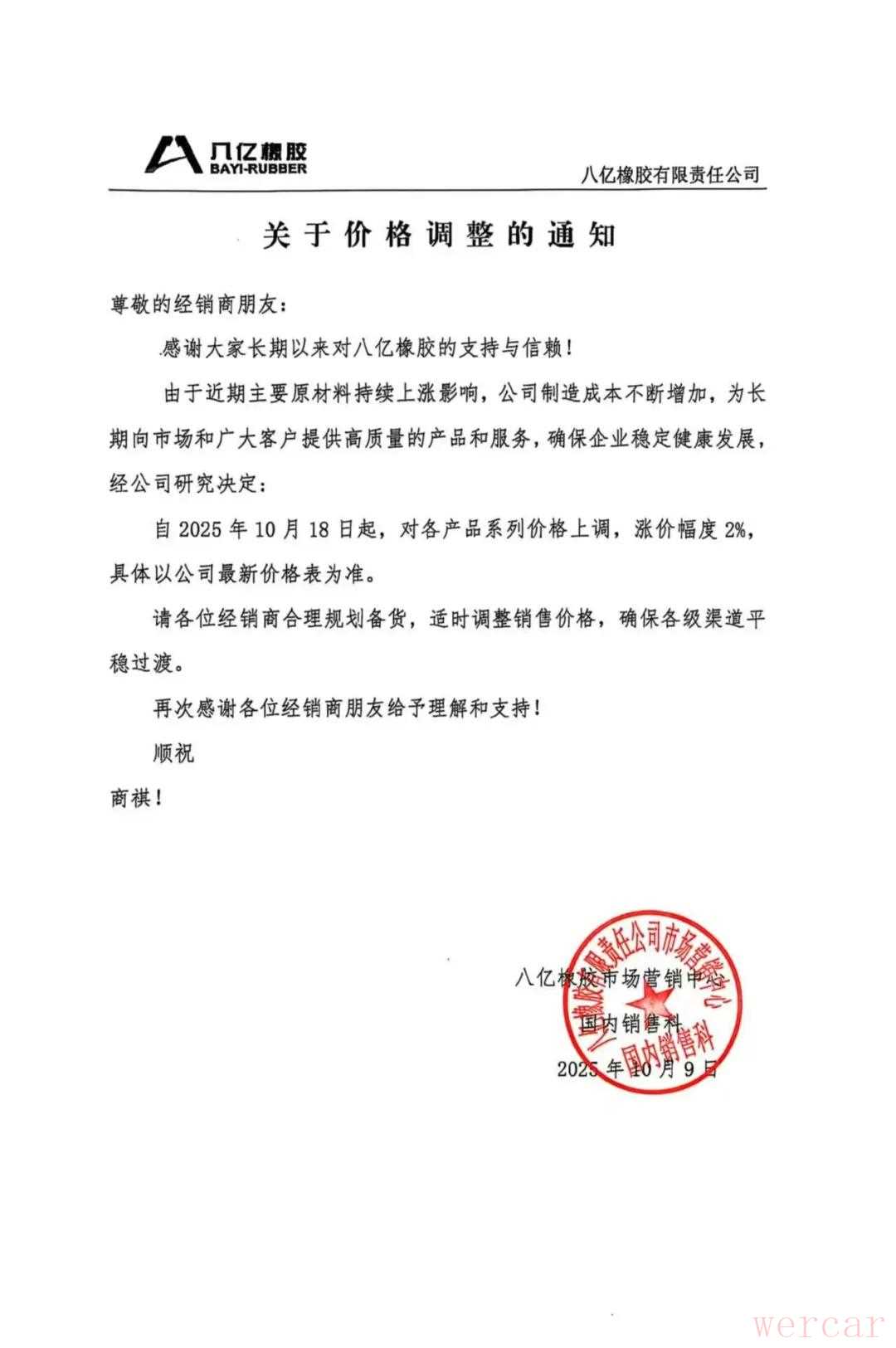 优科豪马在通知中表示,受近期原材料价格持续上涨的影响,工厂制造成本不断上升,公司决定自2025年10月25日起,针对乘用车轮胎产品(不包含冬季胎)进行价格调整,调涨幅度为3%。