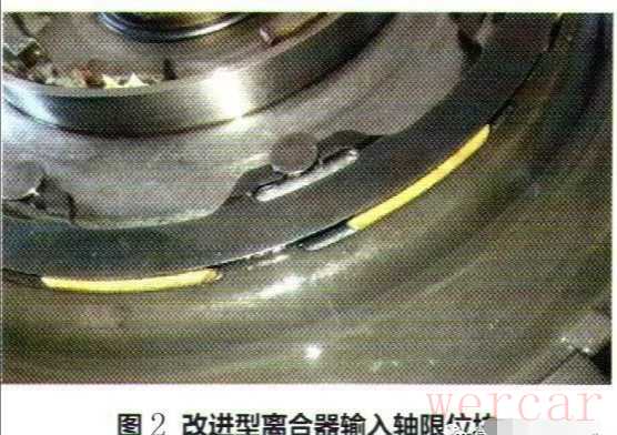 相比原车配件,改进型变速器输入轴油封在唇口周围增加一圈回位弹簧(图1),密封效果更好。改进型离合器输入轴限位块较原车限位块也更宽大,材质更耐磨(图2)。