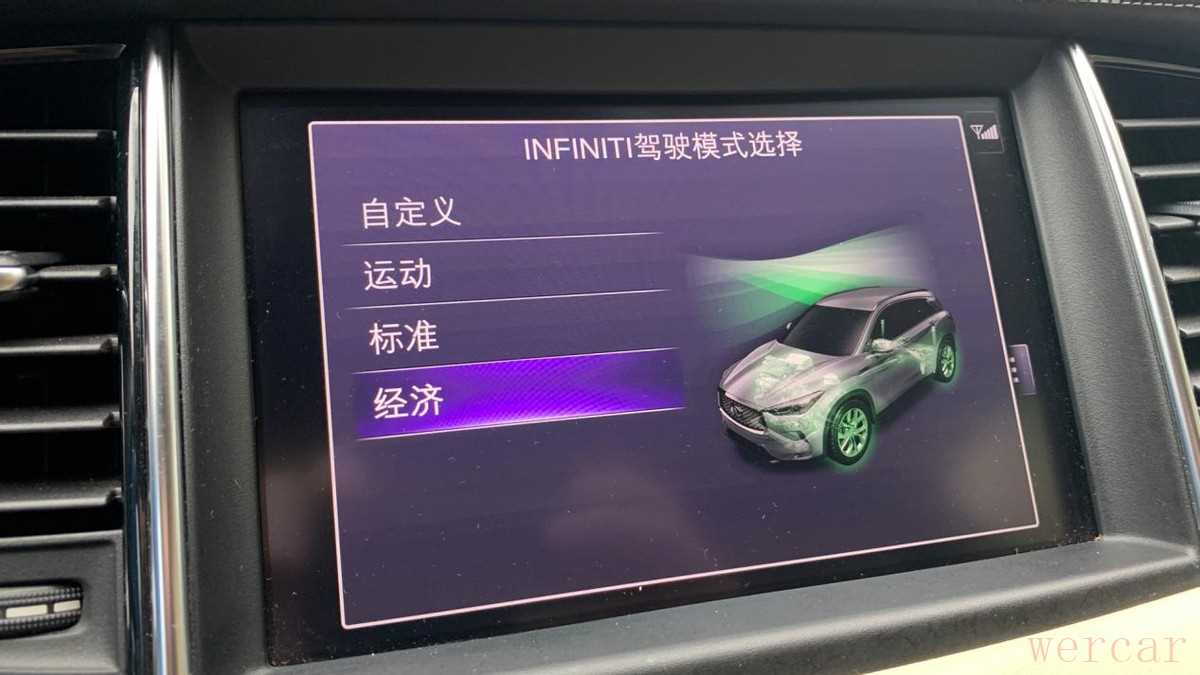 车辆提供了四种驾驶模式,分别为经济、标准、运动和自动定义模式。标准模式下,英菲尼迪QX50在市区路面正常行驶时,整体的动力输出线性,为了保证燃油经济性,像完成超车这种深踩油门的动作时动力会稍有些迟滞,但总体能够快速执行驾驶者发力的指令,完成加速。