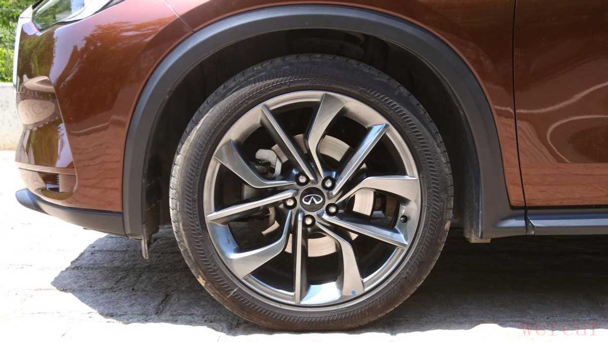 试驾车采用了20英寸枪灰色的五辐式轮辋,造型别致且极具运动感,有质感的同时显得整车下盘极其饱满。使用的普利司通Alenza 001系列SUV专用高性能轮胎,注重抓地力及性能表现,轮胎尺寸为255/45 R20。