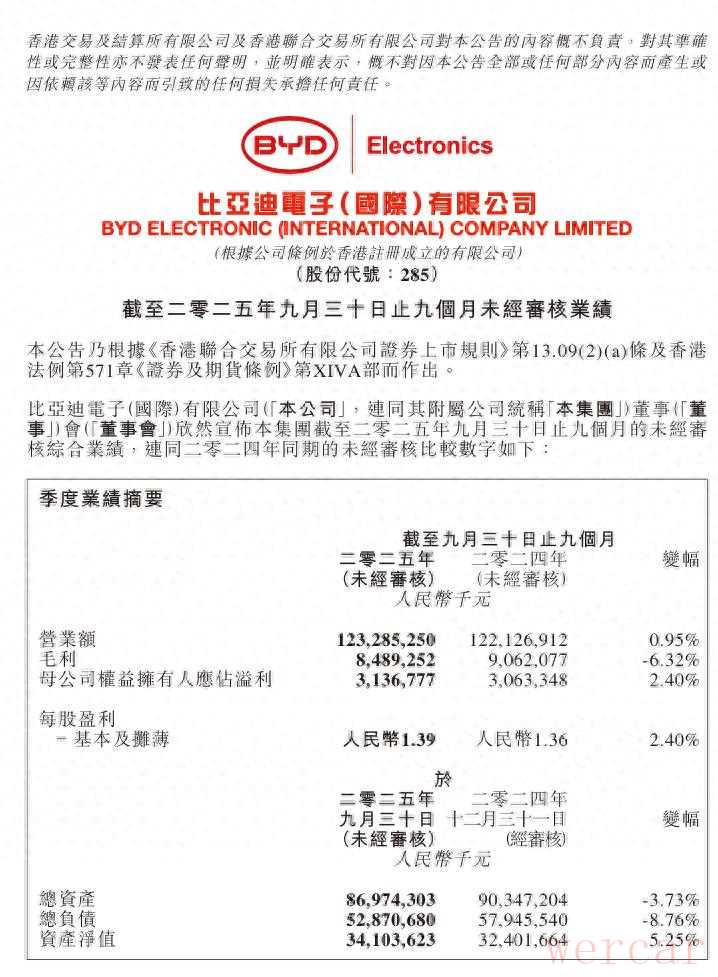 这是一个关于比亚迪电子(BYD Electronic)财务表现的重要信息。