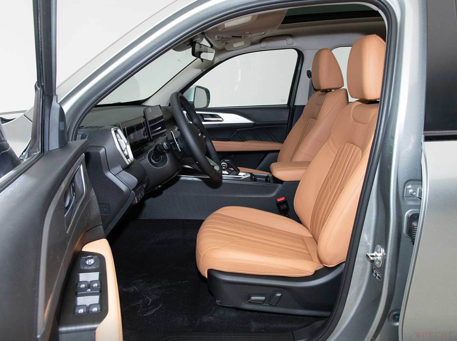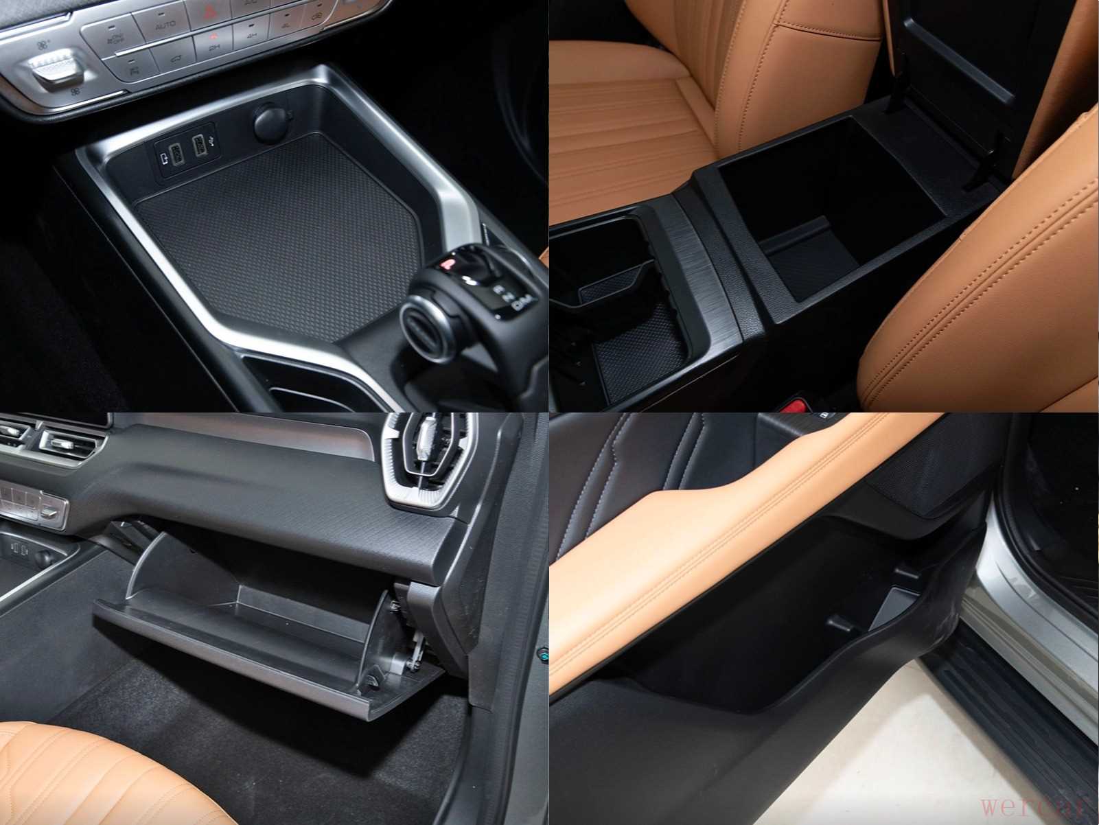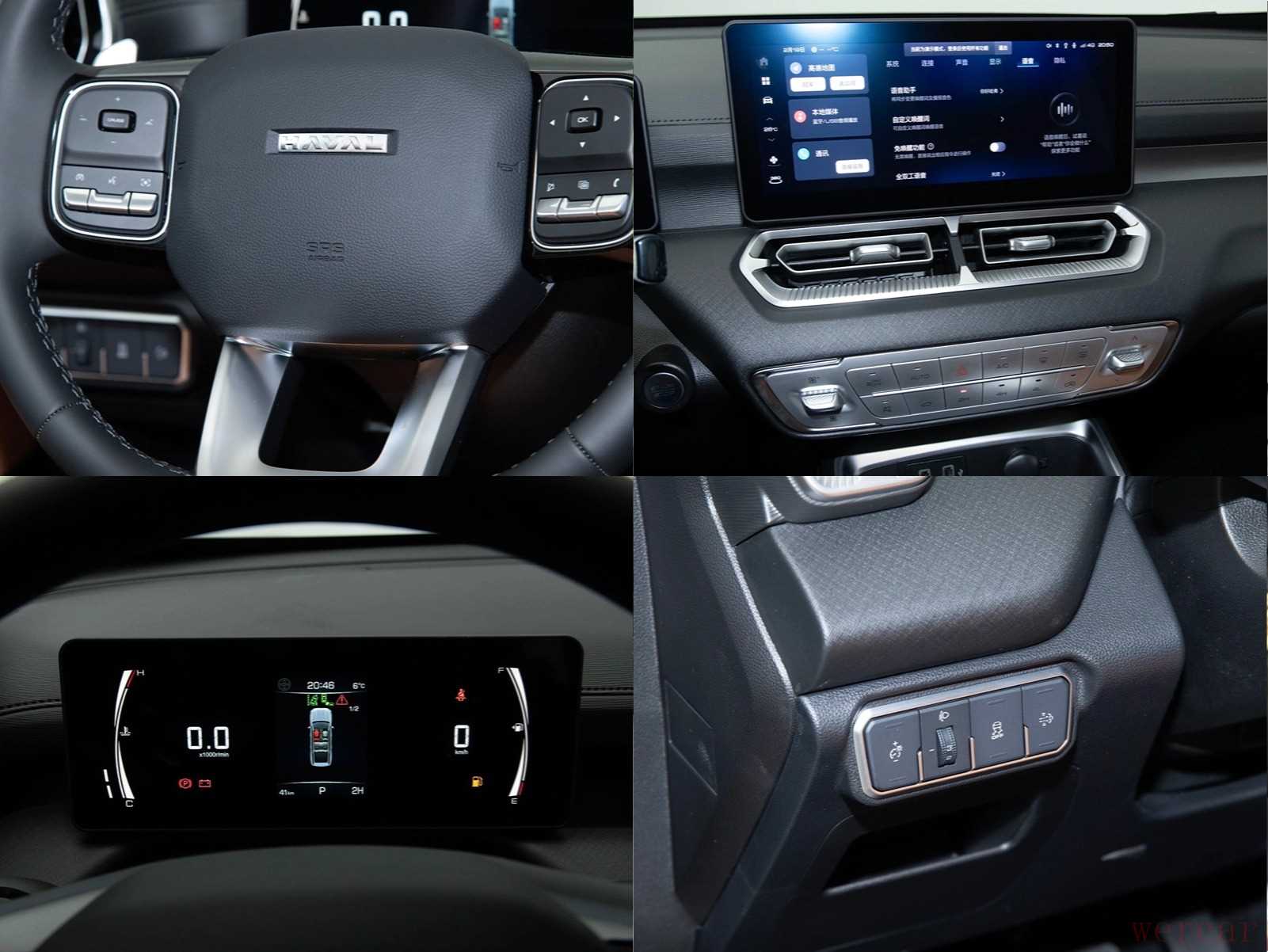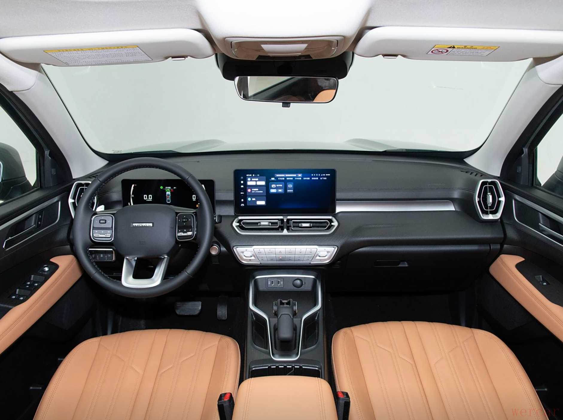 内饰整体布局比较简约,与老款保持一致。车顶跟坦克300很像,包括眼镜盒。仿皮材质座椅虽然没有想象中柔软,但支撑性还不错;并且中高配车型支持加热和电动调节。中央通道区域取消了大量的实体按键,看上去非常简洁。挡把后面是两个杯座,前面储物格里有两个充电接口,把手机放在里面充电,拿取也很方便。中间出风口下面是一排物理按键,盲操作很顺手。