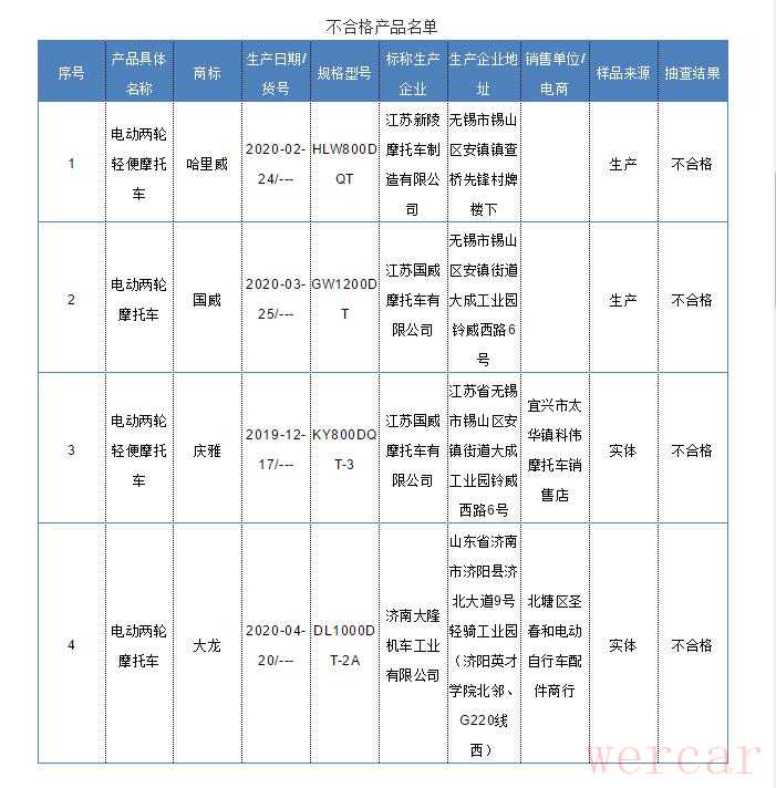 4批次电动摩托车抽检现质量问题,哈里威、国威、庆雅等品牌上榜不合格名单