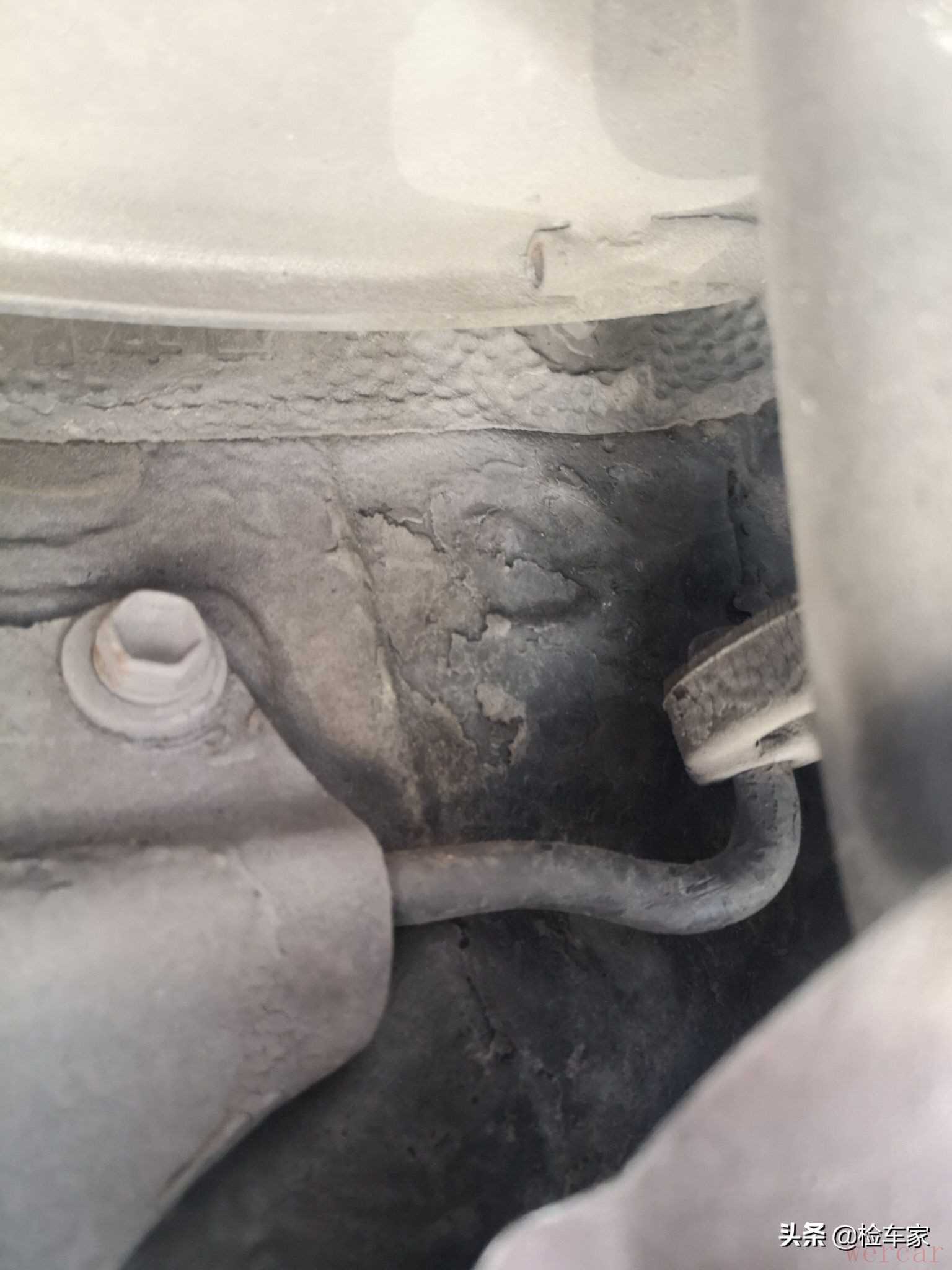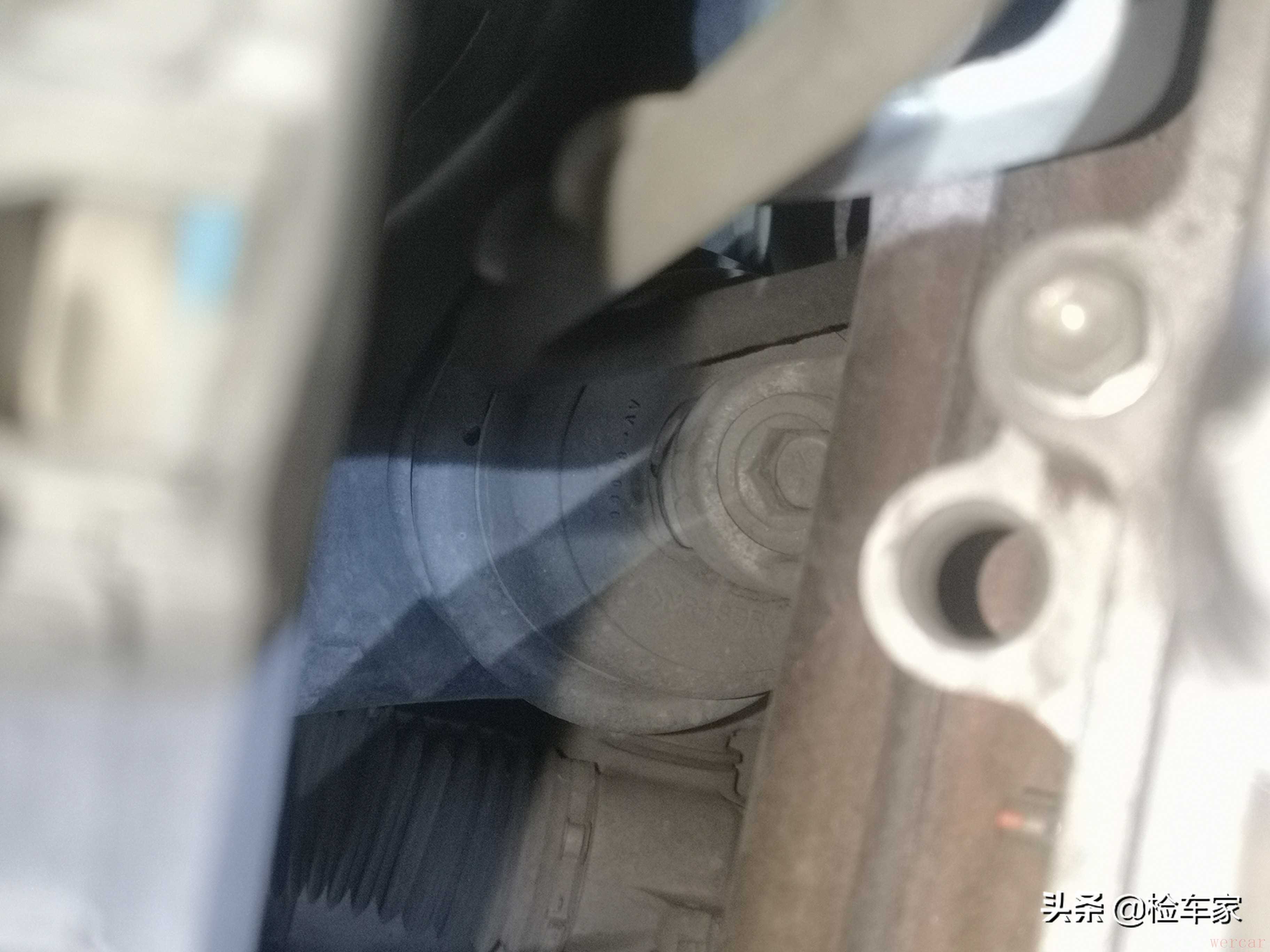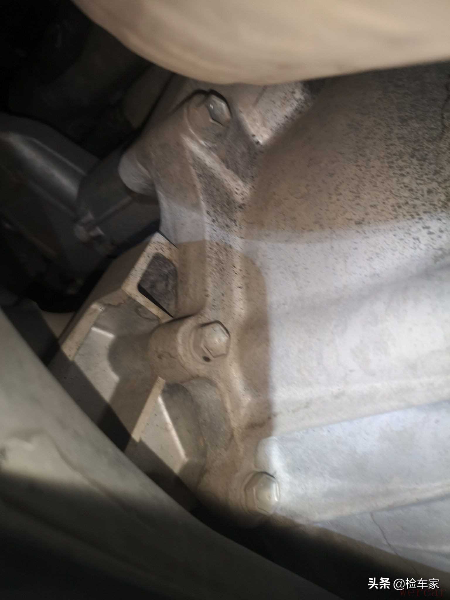 发动机机脚部分检测,并未发现有拆卸的情况,这说明还保持着原装出厂的状态,并没有因为事故导致吊装。等下底盘部分再看看变速箱机脚是否存在拆卸。