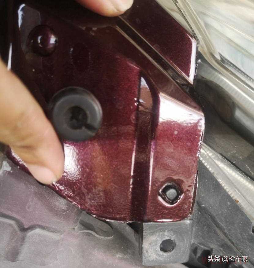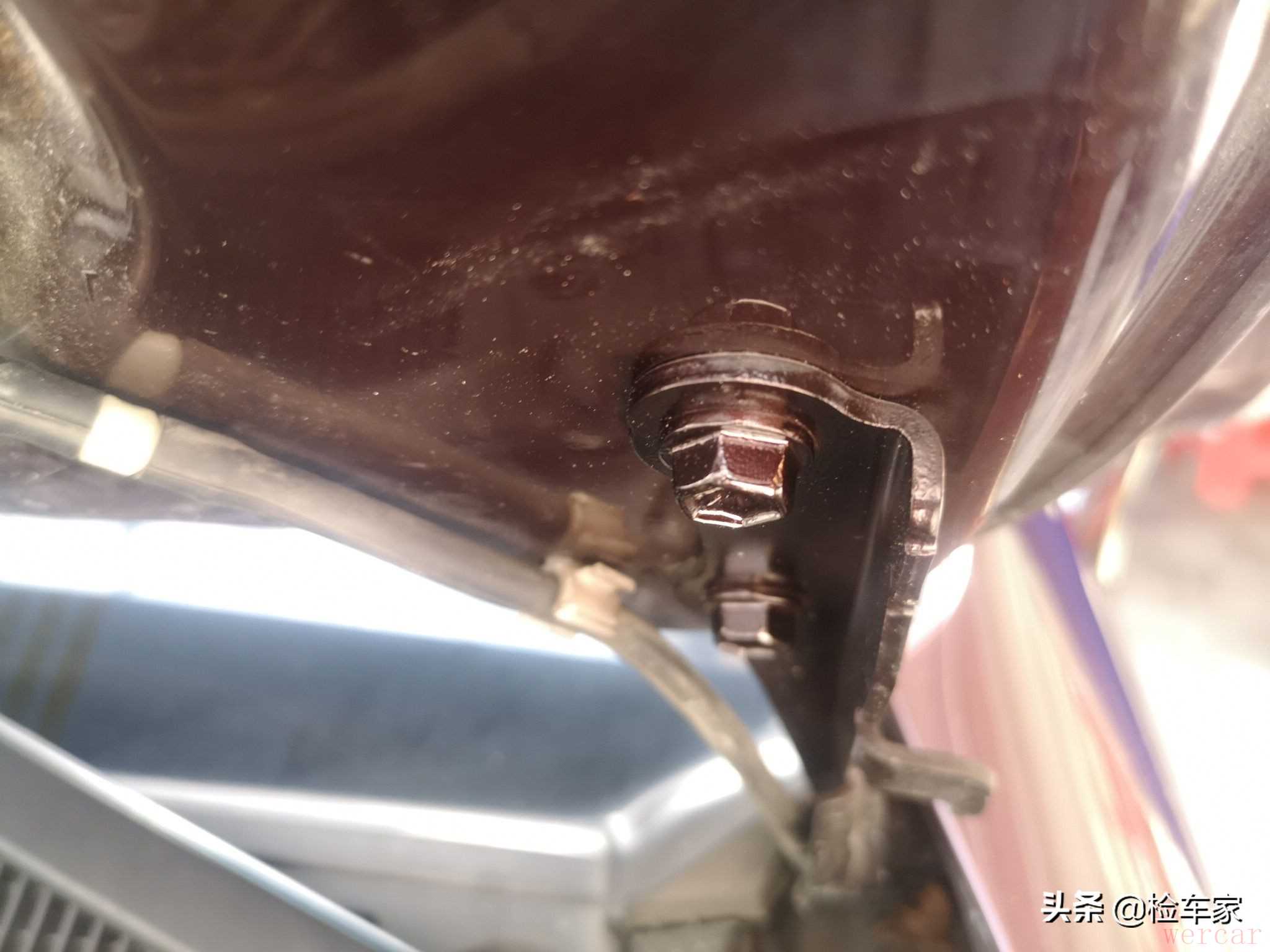 接着我们来到了发动机舱部分检测,首先还是看前盖是有过更换的,但换机盖的这位师傅就还挺走心的,上面螺钉居然还喷漆了,这么有模有样的让一般的小白也看不太出来,但只要你用手摸上去还是能觉察出明显的颗粒感。