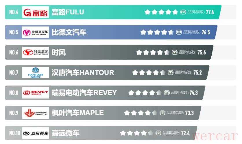 那么,根据“十大品牌榜”第6~10名来看,品牌和品牌指数依次为:富路(77.4)、比德文(76.5)、时风(75.6)、汉唐(75.2)、瑞易(74.3)、枫叶(73.3)、嘉远(72.4)。