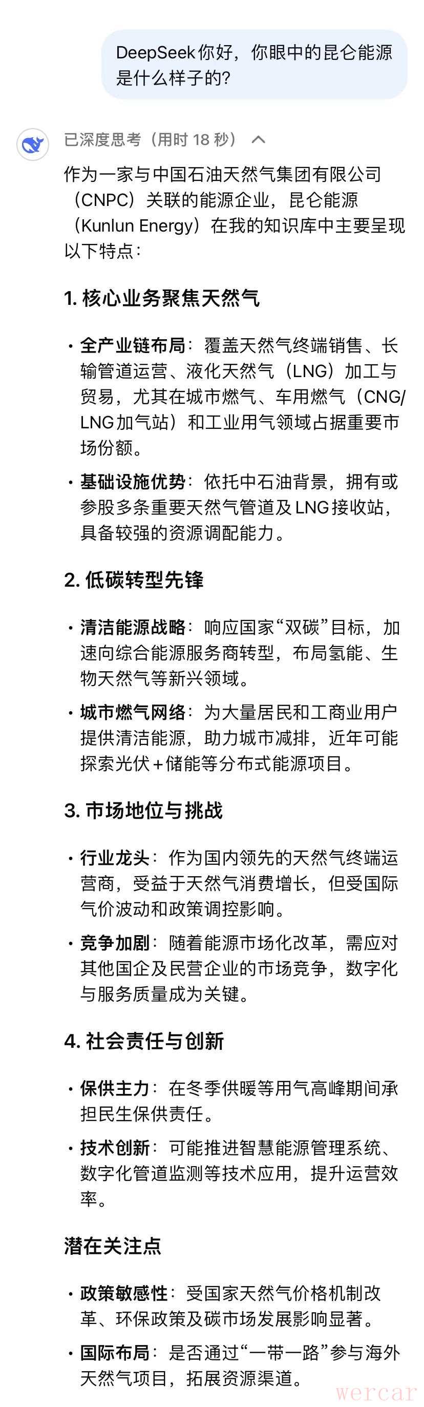 昆仑能源(中国石油天然气集团有限公司的子公司)是中国能源行业的重要参与者,尤其是在天然气领域。在DeepSeek的“眼中”,昆仑能源可以被描绘为以下几个方面的结合体: