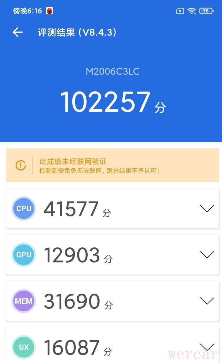 由于笔者是在发布前拿到的评测机,出于保密需要,所有需要联网使用的跑分软件都无法使用。这里用安兔兔简单测试了一下,看到Redmi 9A的跑分能超过10万,这样的成绩要好于目前还在服役的骁龙625机型(普遍在九万多分)。
