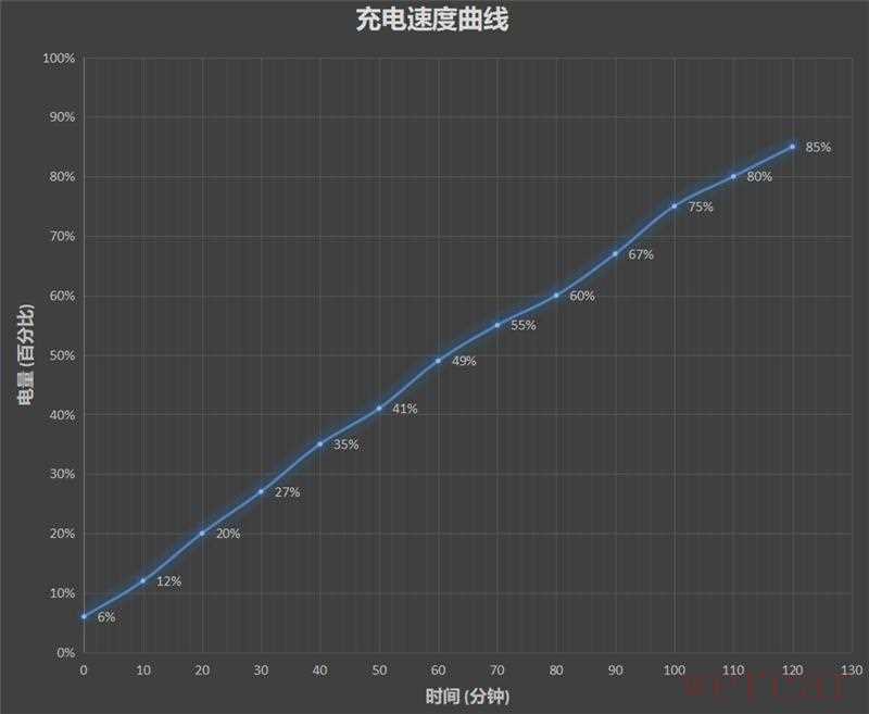 同价位甚至更贵的机型当中还存在“五福一安”的设备,而Redmi 9A支持10W充电,接下来看看测试结果。大半程充电近乎直线,2小时可以将电量从6%充到85%,要充满的话需要的时间可能会更久一些。