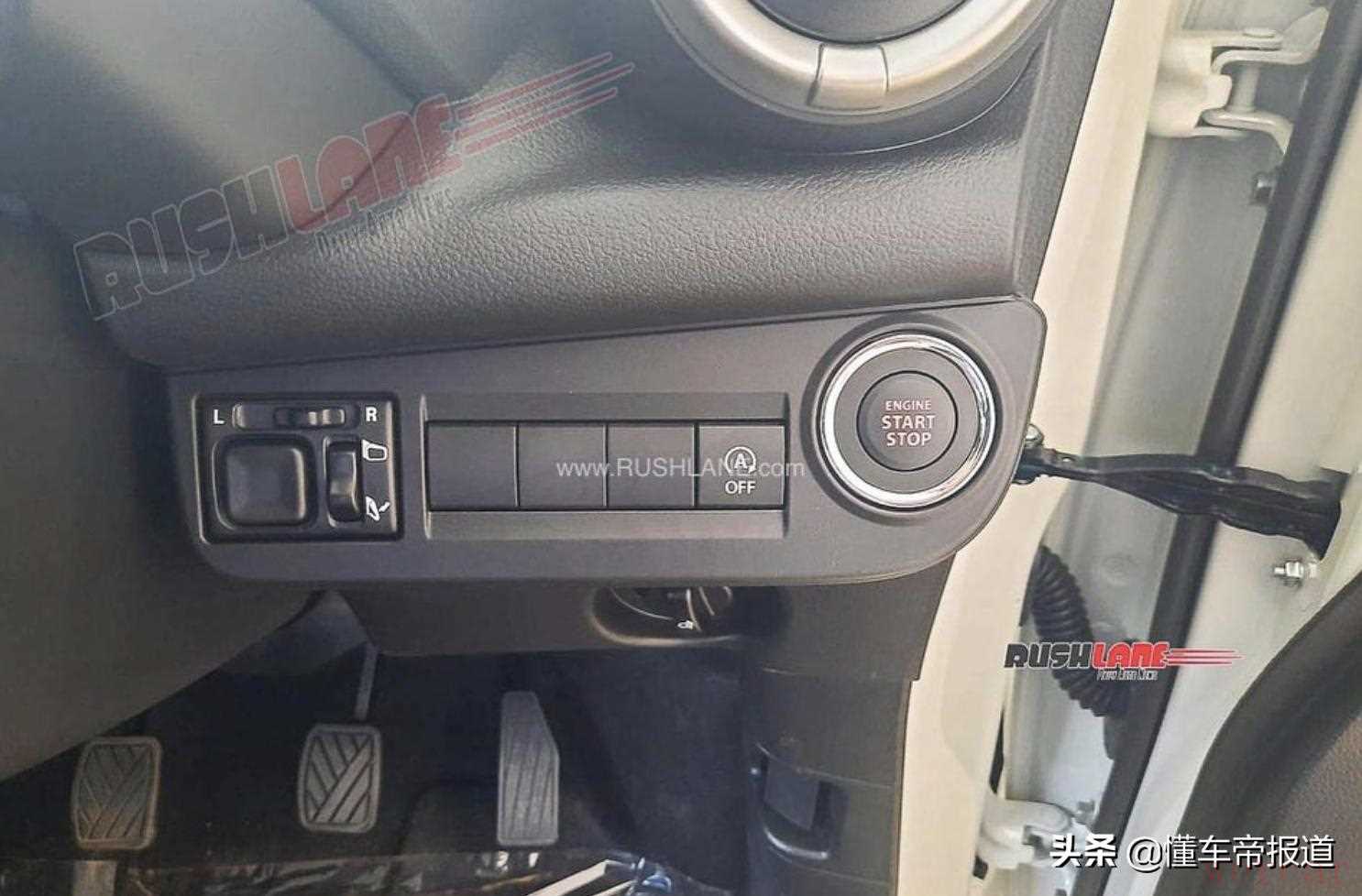 位于方向盘右下侧的一键启动开关、发动机启停开关和外后视镜电动调节按键