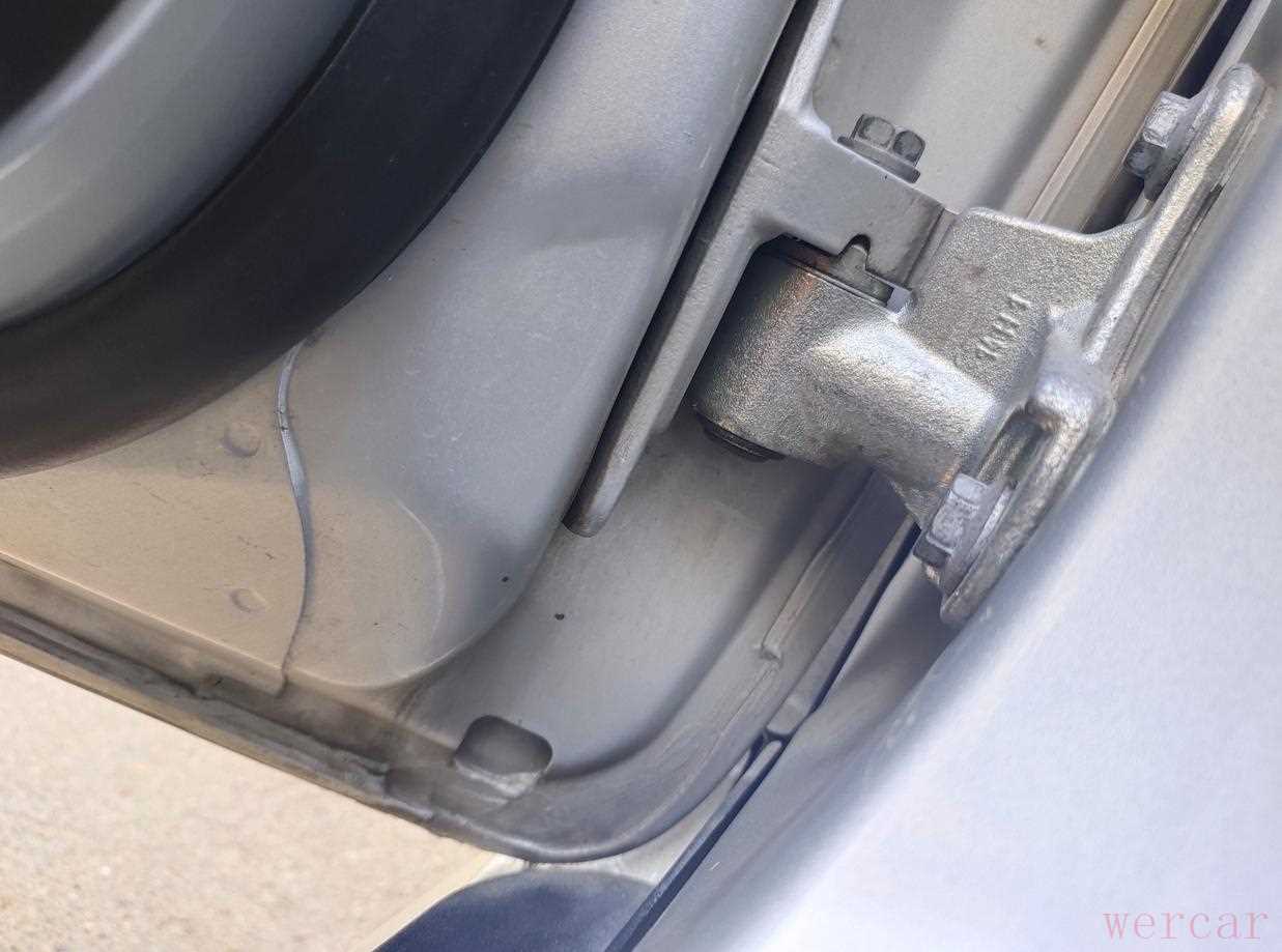 接着往后看,车门的铰链有过更换,这个倒是正常的。长时间的开关门,这个铰链久了肯定就会磨出间隙,导致车门下垂和密封不严,所以到了一定程度必须要更换。看车门的质量和做工倒是符合原厂工艺,就是不知道是不是和前保险杠一样也是更换的拆车件,时间实在是太久远了,也就无从考证了。