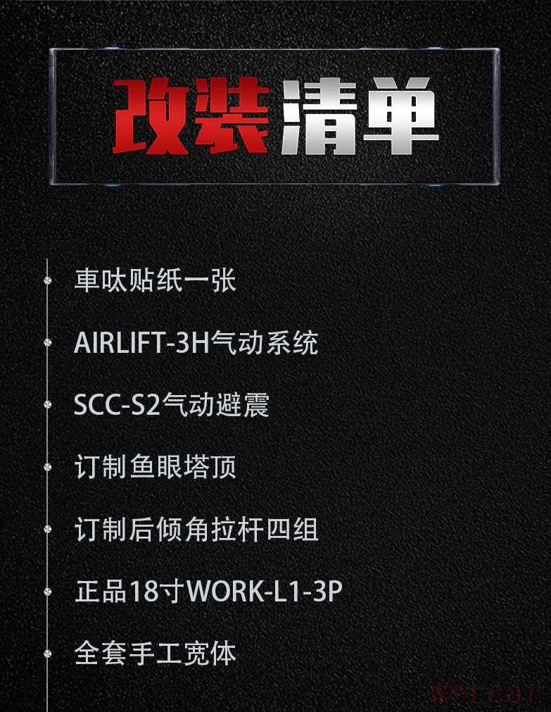 "首先是行走部分,换上了AIR LIFT 3H气动控制系统、SCC AIR气动避震、18寸WORK L1-3P轮毂,结合上定制鱼眼塔顶、定制后倾角拉杆,做出了个比较完美的姿态效果。"